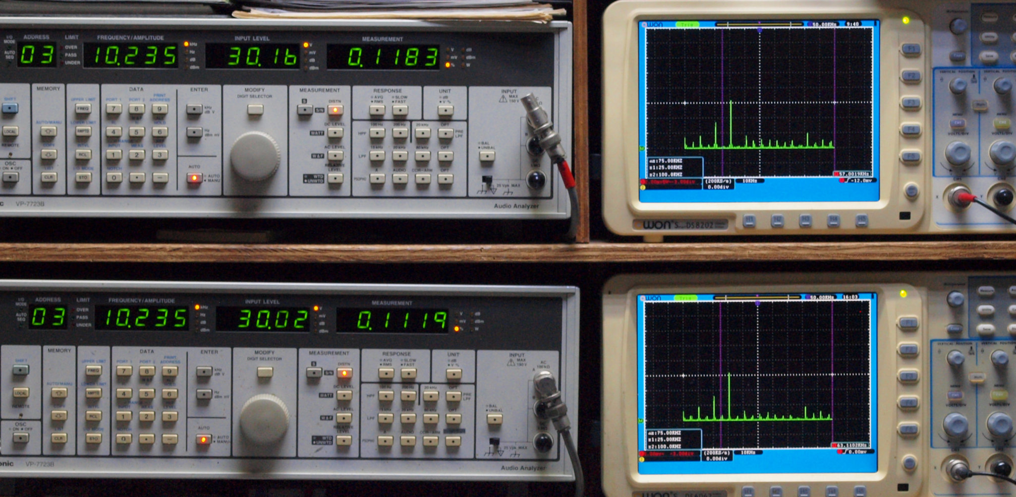 | E. 測定・調整。 画像をクリックすると、大きく(横幅2050ドット)表示されます。 E0. 出力・歪み率測定・調整 「見方」。 上段中 右側SP出力を「Audio Analyzer Panasonic VP−7723B」により測定。 表示LED、 左端=メモリーNo、 中左=周波数測定、 中右=出力電圧測定、 右端=歪み率測定。 上段右端 VP−7723Bの基本波除去出力を「owon SDS8202(200MHZ)」で「FFT分析」表示。 下段中 左側SP出力を「Audio Analyzer Panasonic VP−7723B」により測定。 表示LED、 左端=メモリーNo、 中左=周波数測定、 中右=出力電圧測定、 右端=歪み率測定。 下段右端 VP−7723Bの基本波除去出力を「owon SDS6062(200MHZ)」で「FFT分析」表示。 下段左端 オーディオ発振器 VP−7201A より50Hz〜100kHzの信号を出し(歪み率=約0.003%)、ATT+分配器を通し、AMPに入力。 よって、ダイアル設定出力レベルより低くなります。測定機器の仕様や整備の様子はこちら、「VP−7723B」「VP−7201A」。 FFT画面の見方はこちら。 |