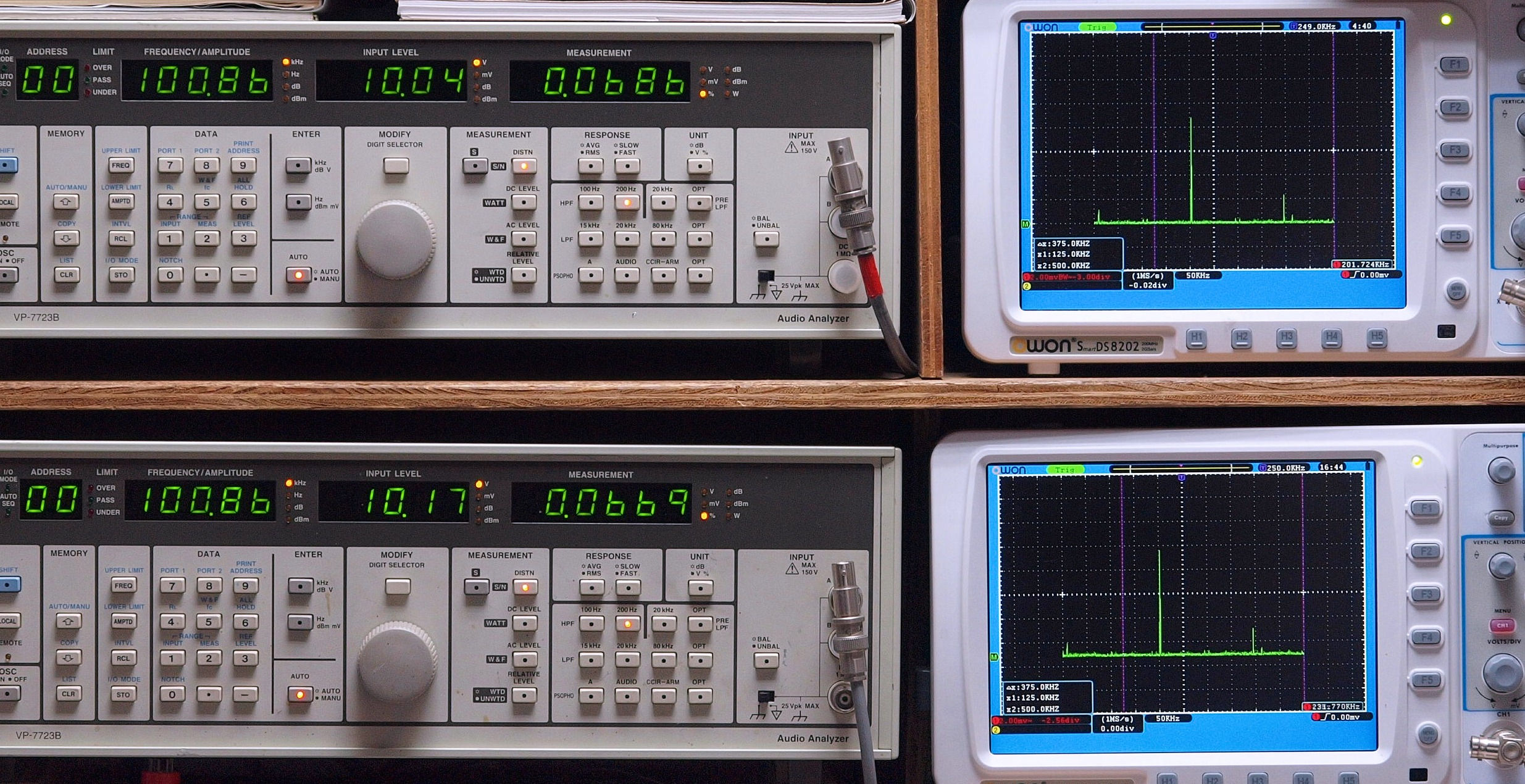 | E. 測定・調整 E1. 出力・歪み率測定・調整 「見方」。 上段中 右側SP出力を「Audio Analyzer Panasonic VP−7723B」により測定。 表示LED、 左端=メモリーNo、 中左=周波数測定、 中右=出力電圧測定、 右端=歪み率測定。 上段右端 VP−7723Bの基本波除去出力を「owon SDS8202(200MHZ)」で「FFT分析」表示。 下段中 左側SP出力を「Audio Analyzer Panasonic VP−7723B」により測定。 表示LED、 左端=メモリーNo、 中左=周波数測定、 中右=出力電圧測定、 右端=歪み率測定。 下段右端 VP−7723Bの基本波除去出力を「owon SDS6062(200MHZ)」で「FFT分析」表示。 下段左端 オーディオ発振器 VP−7201A より50Hz〜100kHzの信号を出し(歪み率=約0.003%)、ATT+分配器を通し、AMPに入力。 よって、ダイアル設定出力レベルより低くなります。測定機器の仕様や整備の様子はこちら、「VP−7723B」「VP−7201A」。 FFT画面の見方はこちら。 |