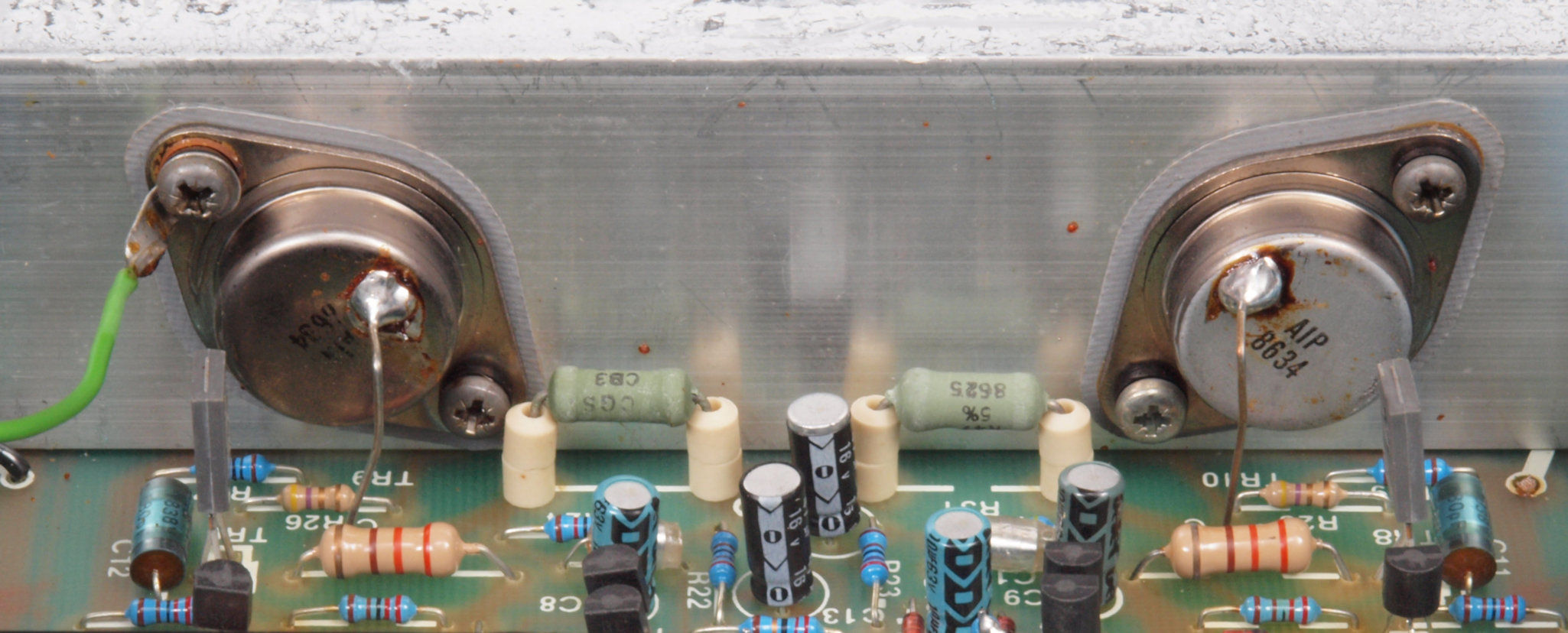 A91. 点検中 終段TR(トランジスター)のエミッター抵抗(低歪タイプ)は測定中して選別使用。福島双羽電機(株)製。