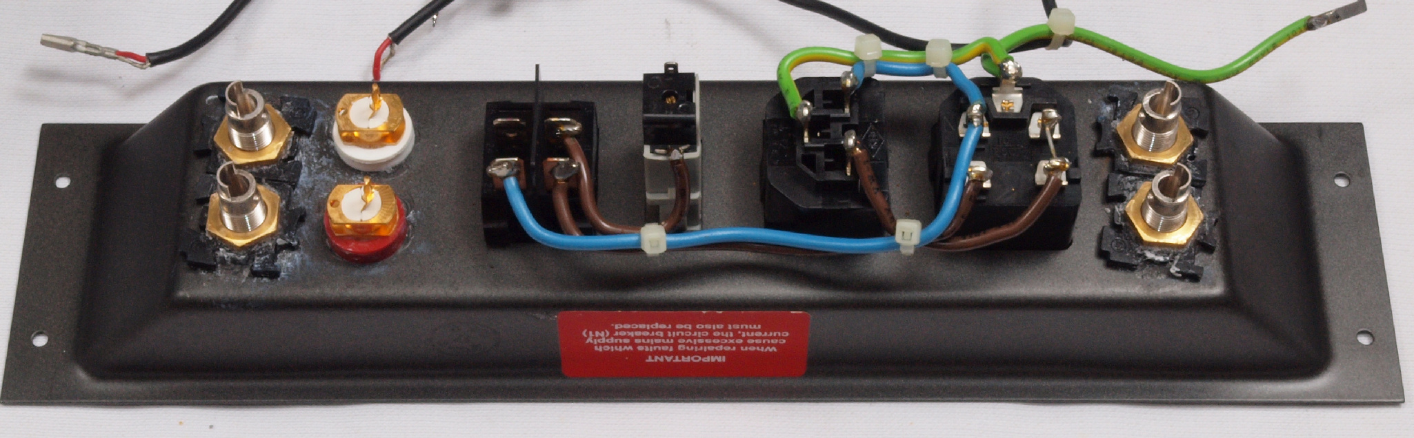 | C52. 修理(交換)後 端子パネル「SP出力端子・RCA入力端子」 RCA端子をWBT2010交換、SP出力端子をWBT−0730PLに交換。 |