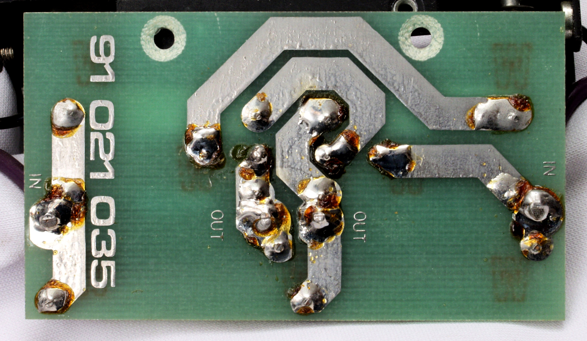 C911. 修理中 L側−終段TR(トランジスター)基板裏「−」、大きな事故で液漏れして腐食した銅箔。