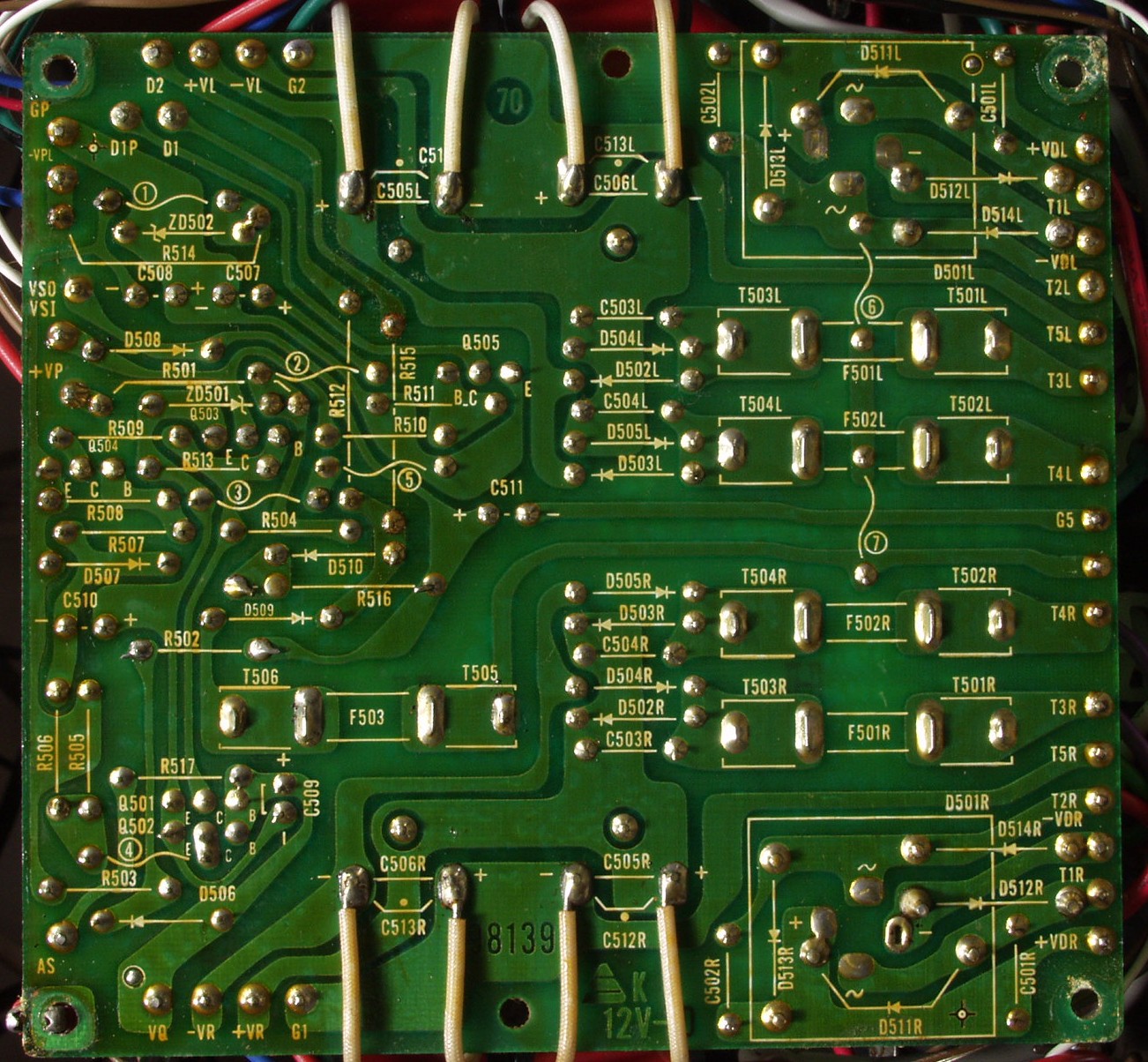 | C3B. 修理後 電源基盤 フューズ入り抵抗全部、電解コンデンサー9個交換 ジャンパー線も半田を浸み込ませる |