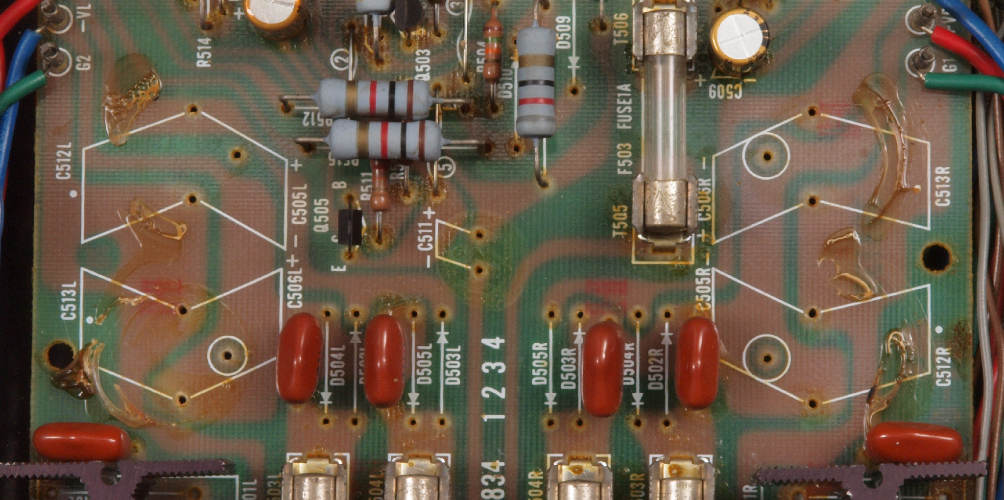| C. 修理状況。 画像をクリックすると、大きく(横幅2050ドット)表示されます。 C11. 修理前 R側ドライブ基板 |