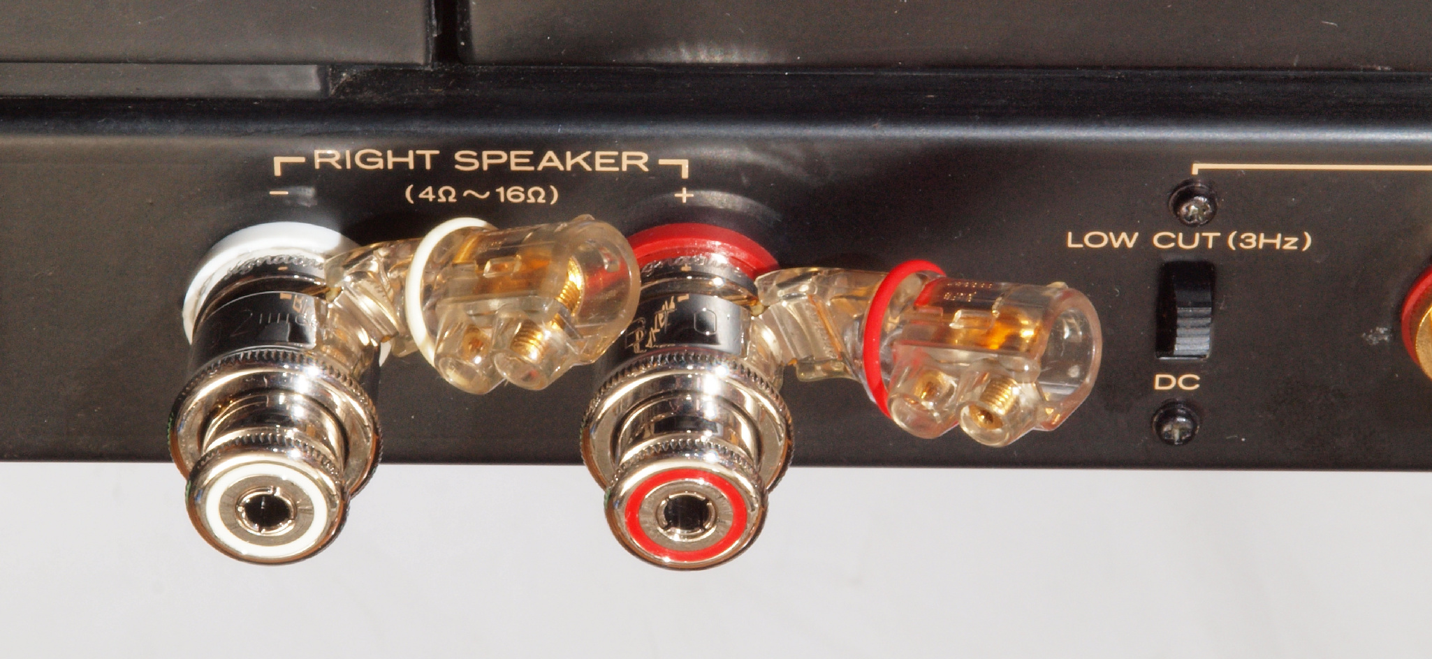 | 注意 このAMPはアースラインが浮いています。 AMPのシャーシにSPの線(アース側)やプリAMPのアースもも接続してはいけません。 RL−SPのアース線も接続(共通)してもいけません、+−の撚りのあるのも使用出来ません。 又、DC(directconnection)入力が可能ですが、絶対に使用しないこと=ここ参照 |