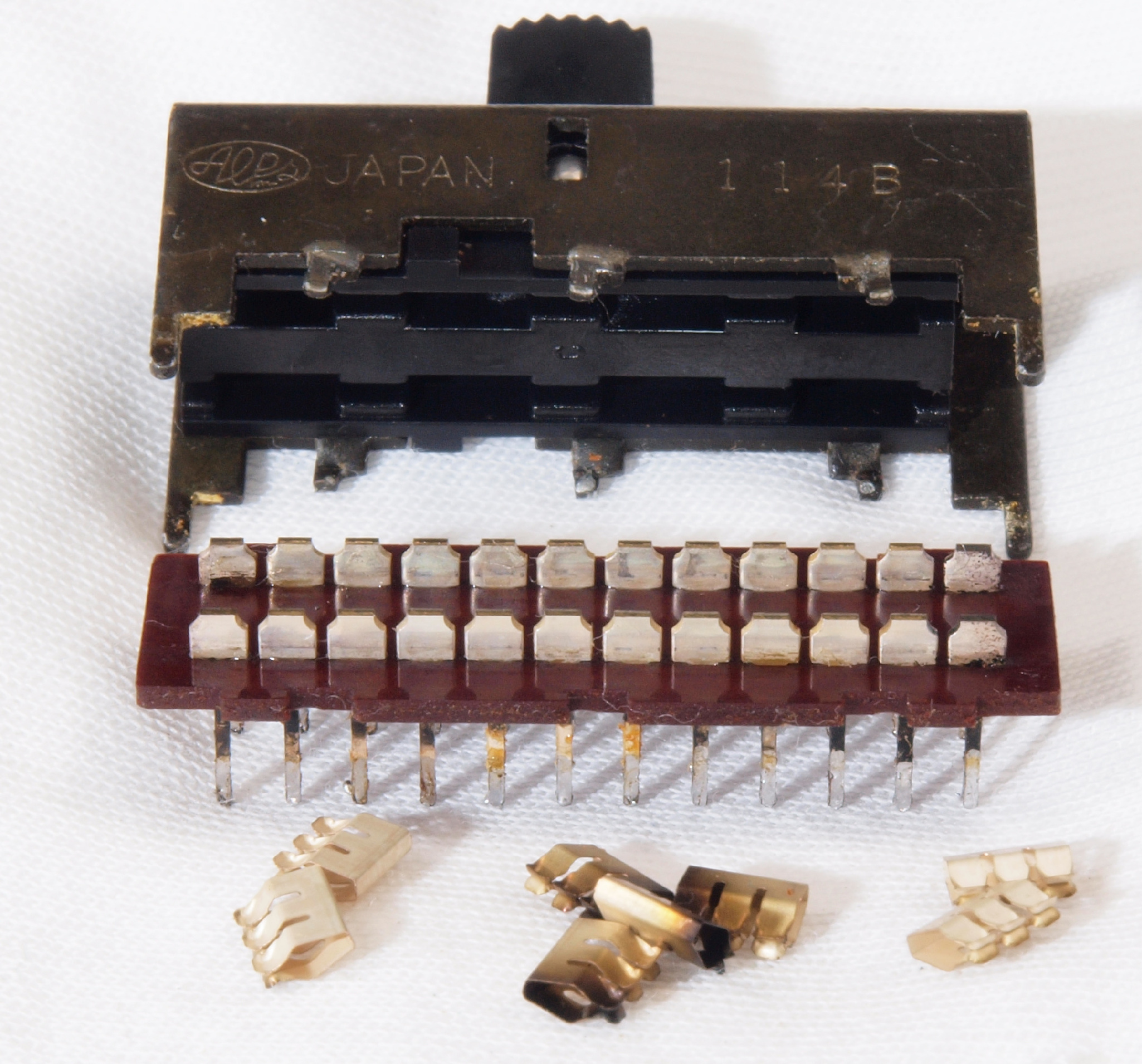 C6C. 修理後 RCA端子基板の切り換えSW分解。使用するのは端の1回路のみ、内側の綺麗な接触子と交換して組む。