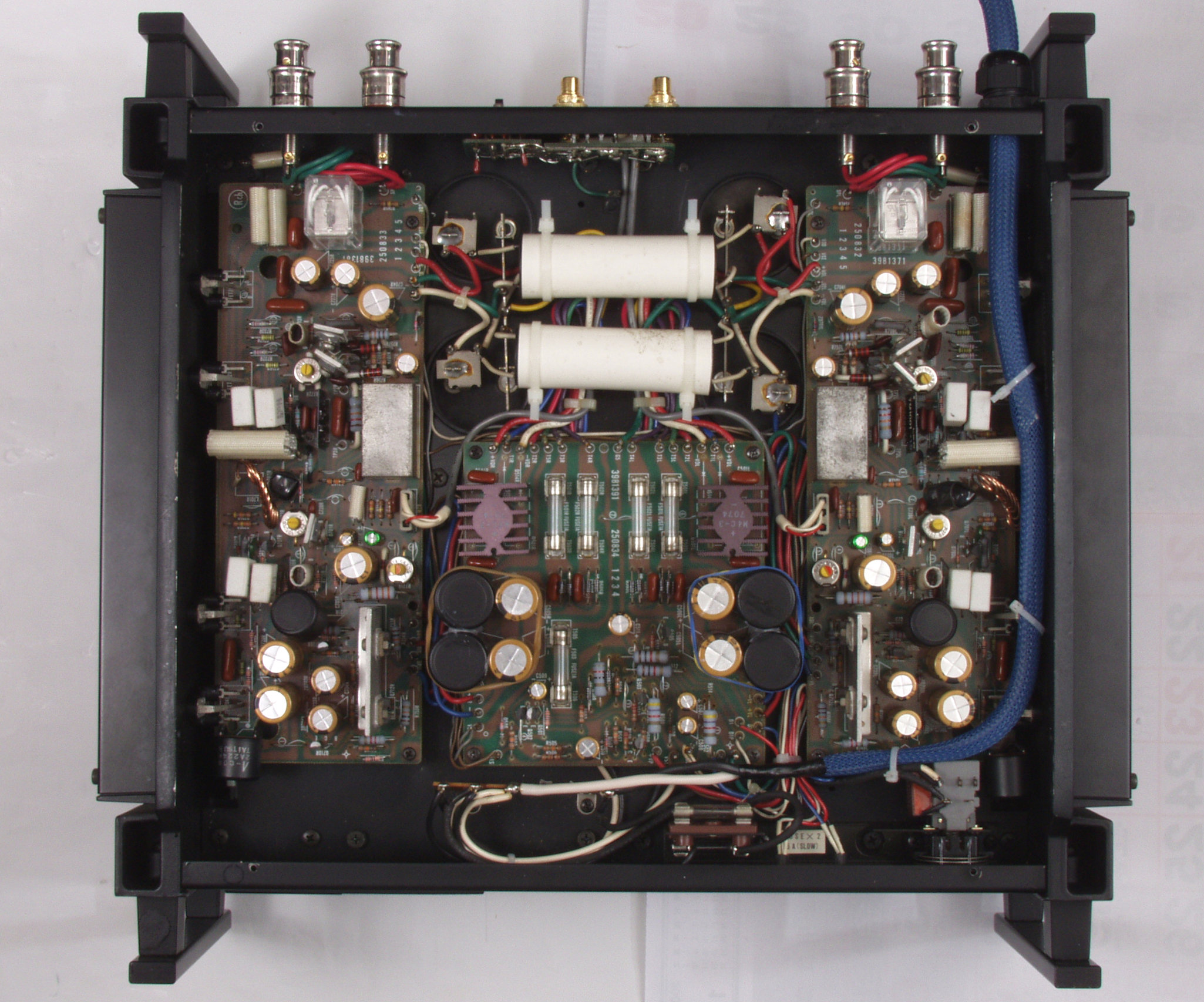 | 注意 このAMPはアースラインが浮いています。 AMPのシャーシにSPの線(アース側)やプリAMPのアースもも接続してはいけません。 RL−SPのアース線も接続(共通)してもいけません、+−の撚りのあるのも使用出来ません。 又、DC(directconnection)入力が可能ですが、絶対に使用しないこと=ここ参照 |