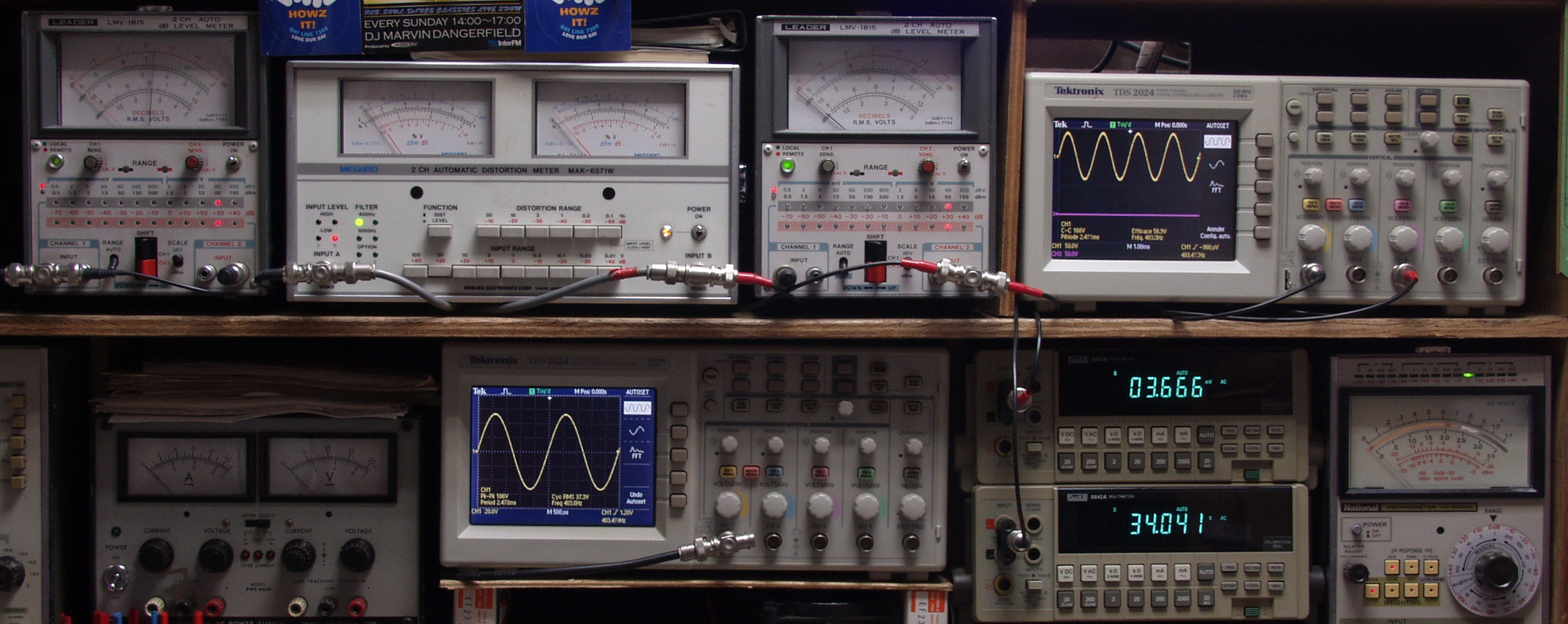 上段中左 歪み率計=出力の歪み率測定 左メータ=L出力、右メータ=R出力。