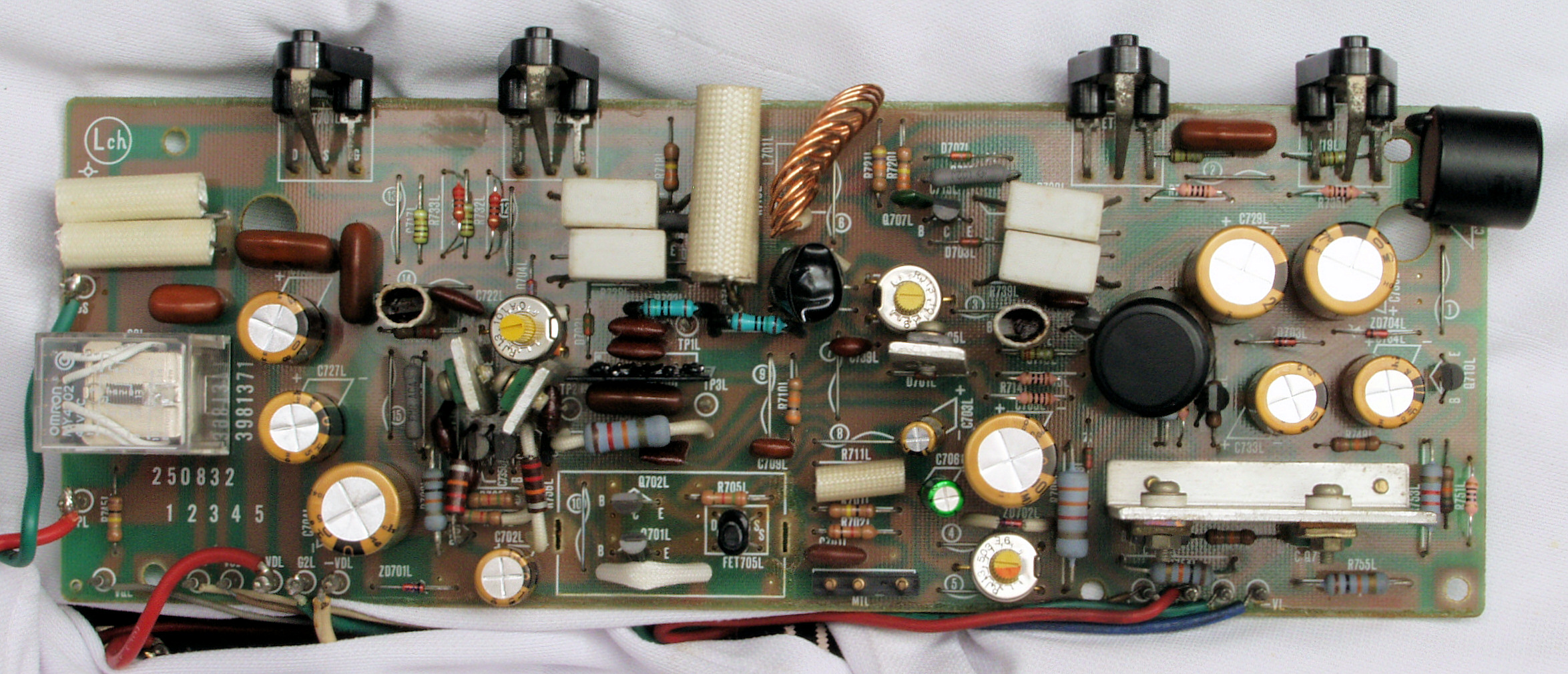 | C22. 修理後 L側ドライブ基板 初段FET(電界効果トランジスター)、バランス/バイアス調整用半固定VR3個、SP接続リレー交換 フューズ入り抵抗全部、電解コンデンサー11個交換 |