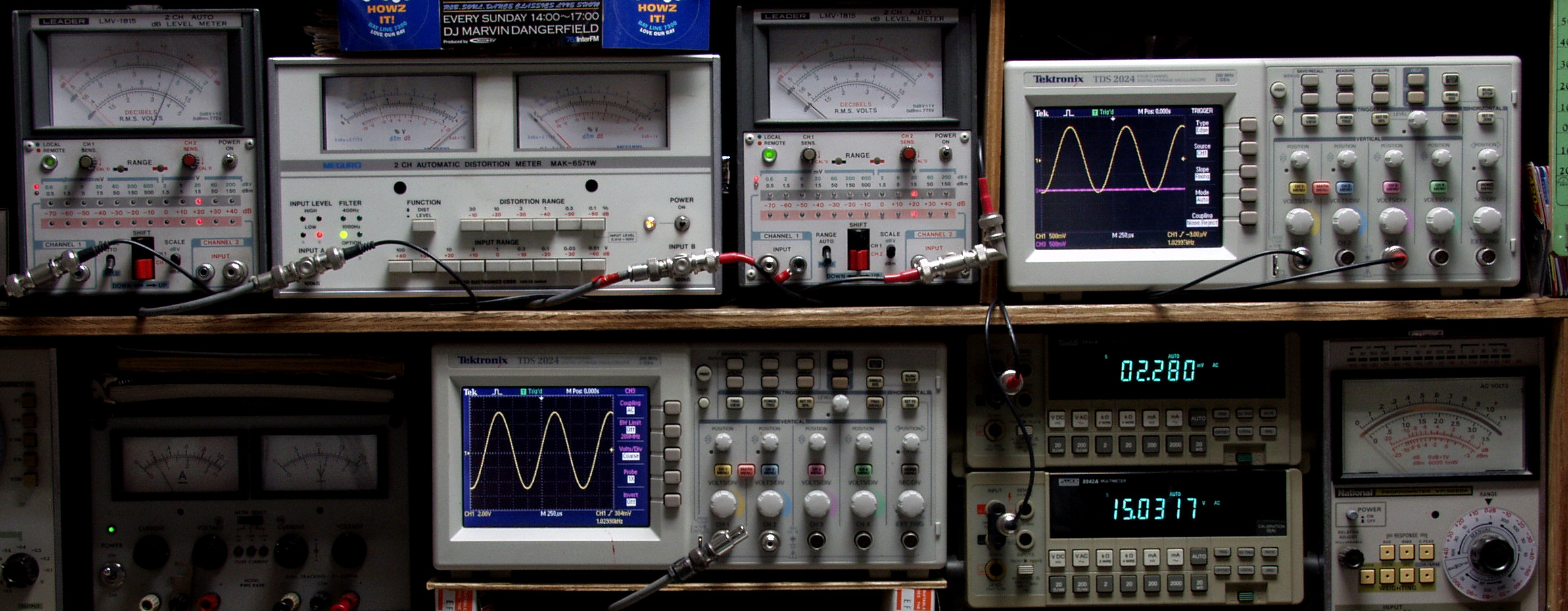 | T. 修理前点検測定。 画像をクリックすると、大きく(横幅2050ドット)表示されます。 T0. 出力・歪み率測定。 「見方」。 下段左端 オーディオ発振器より400HZ・1KHZの信号を出し(歪み率=約0.003%)これをAMPに入力し、出力を測定。 下段中央 オシロ=入力波形(オーディオ発振器のTTLレベル表示)。 上段左端 交流電圧計=L側出力電圧測定、黒針のみ使用。 上段中左 歪み率計=出力の歪み率測定 左メータ=L出力、右メータ=R出力。 上段中右 交流電圧計=R側出力電圧測定、赤針のみ使用。 上段右端 オシロ=出力波形表示、 赤表示=R出力、黄色表示=L出力。(実際にはRL交流電圧計の出力「Max1V」を観測)。 下段中右上 デジタル電圧計=R出力電圧測定。 下段中右下 デジタル電圧計=L出力電圧測定。 |
