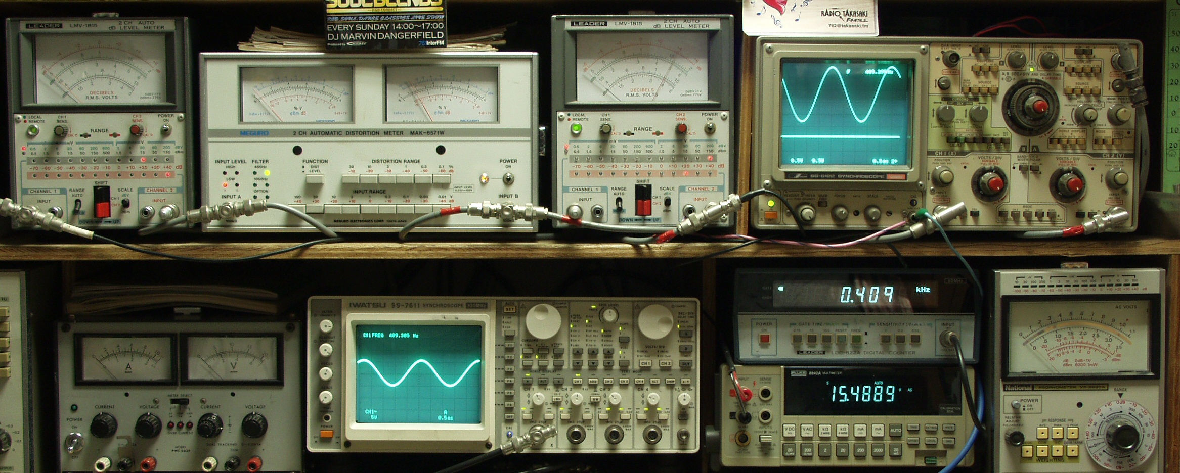 | AE. 修理前の測定 AE−1. 出力・歪み率測定 <見方> 下段左端 オーディオ発振器より400HZ・1KHZの信号を出し(歪み率=約0.003%)これをAMPに入力し、出力を測定 下段中左 オシロ=入力波形(オーディオ発振器のTTLレベル) 下段中右上=周波数計 上段左端 電圧計=L側出力電圧測定、黒針のみ使用 上段中左 歪み率計=出力の歪み率測定 左メータ=L出力、右メータ=R出力 上段中右 電圧計=R側出力電圧測定、赤針のみ使用 上段右端 オシロ=出力波形 上=R出力、下=L出力(実際にはRL電圧計の出力「Max=1V」を観測) 下段中右上 デジタル電圧計=出力電圧測定RLは切り替えて測定 |
