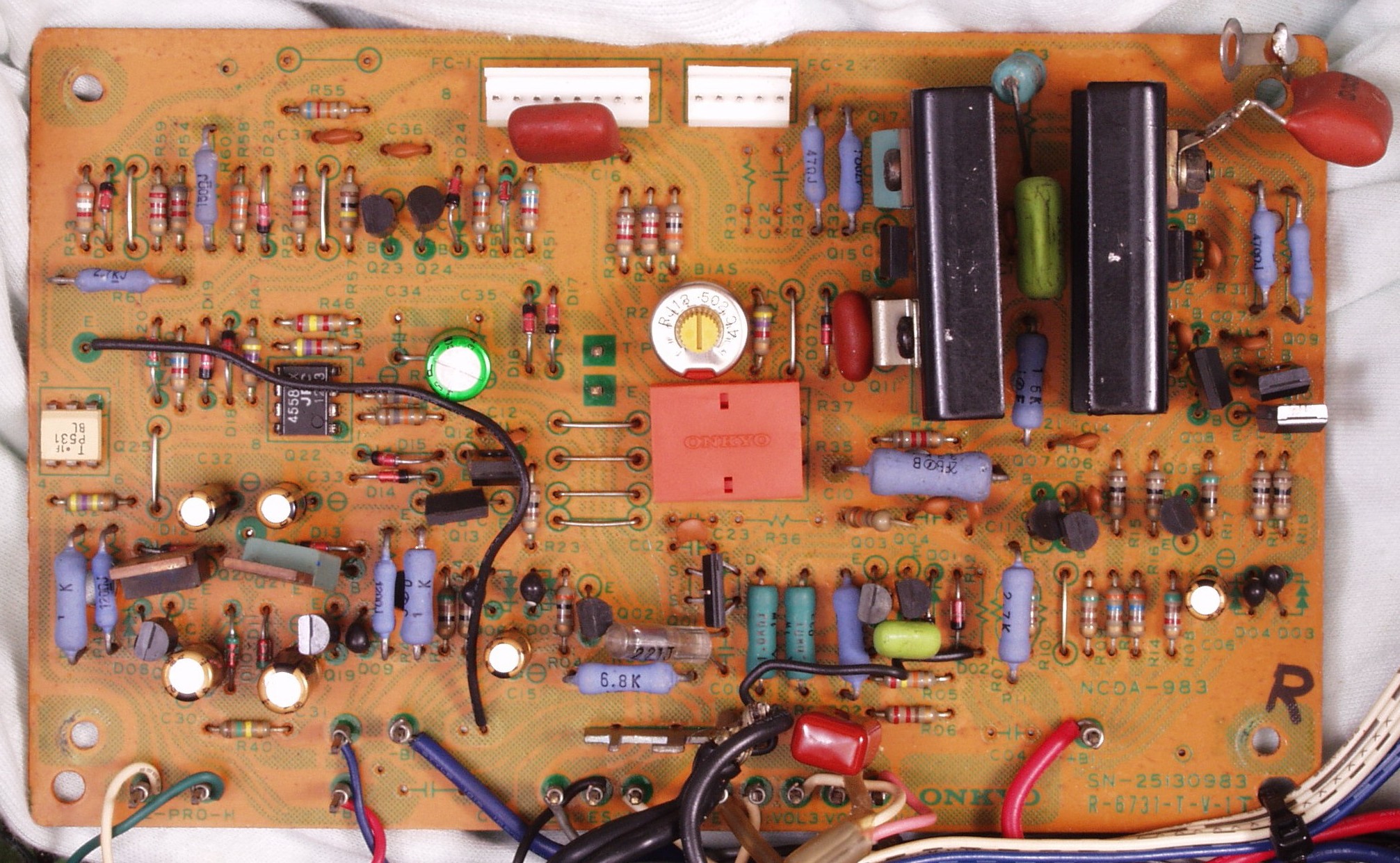 | C12. 修理後 Rドライブ基板。 初段FET、バイアス調整用半固定VR、電解コンデンサー7個交換。 DCカットフイルムコンデンサー追加。 |