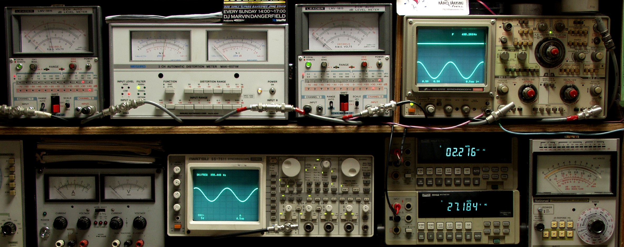 | T. 修理前点検測定 T1. 出力・歪み率測定 <見方> 下段左端 オーディオ発振器より400HZ・1KHZの信号を出し(歪み率=約0.003%)これをAMPに入力し、出力を測定 下段中左 オシロ=入力波形(オーディオ発振器のTTLレベル) 下段中右上=周波数計 上段左端 電圧計=L側出力電圧測定、黒針のみ使用 上段中左 歪み率計=出力の歪み率測定 左メータ=L出力、右メータ=R出力 上段中右 電圧計=R側出力電圧測定、赤針のみ使用 上段右端 オシロ=出力波形 上=R出力、下=L出力(実際にはRL電圧計の出力「Max1V」を観測) 下段中右上 デジタル電圧計=R出力電圧測定 下段中右下 デジタル電圧計=L出力電圧測定 |