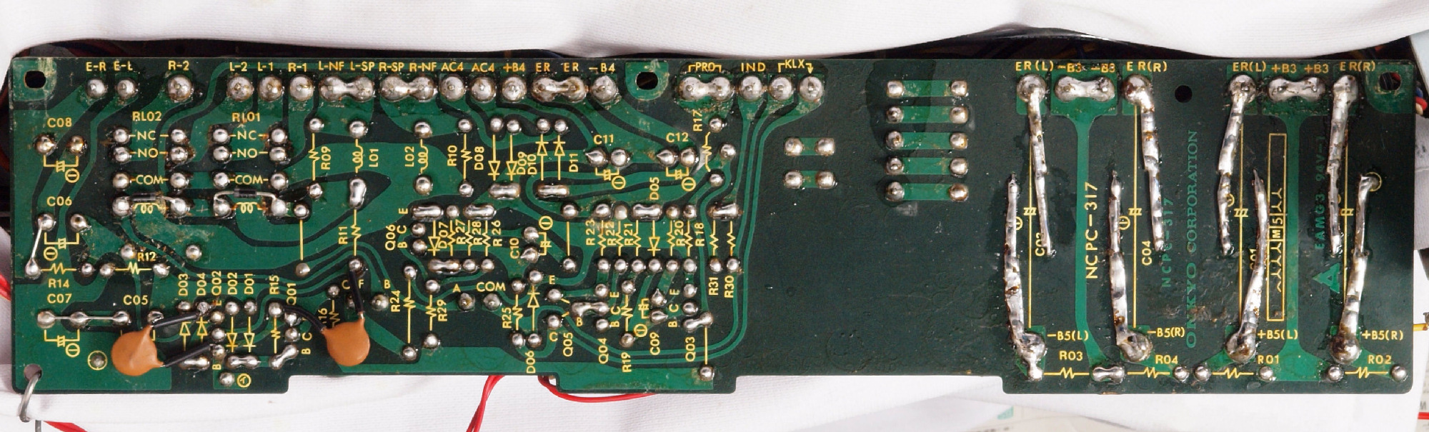 C54. 修理(半田補正)後 R側プリAMP・ピークモニター基板裏  半田を全部やり直す