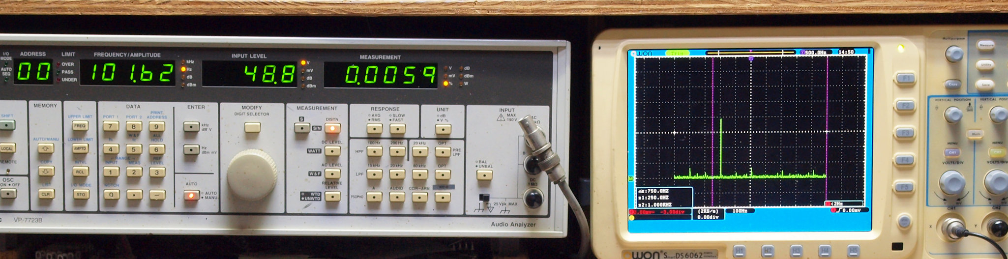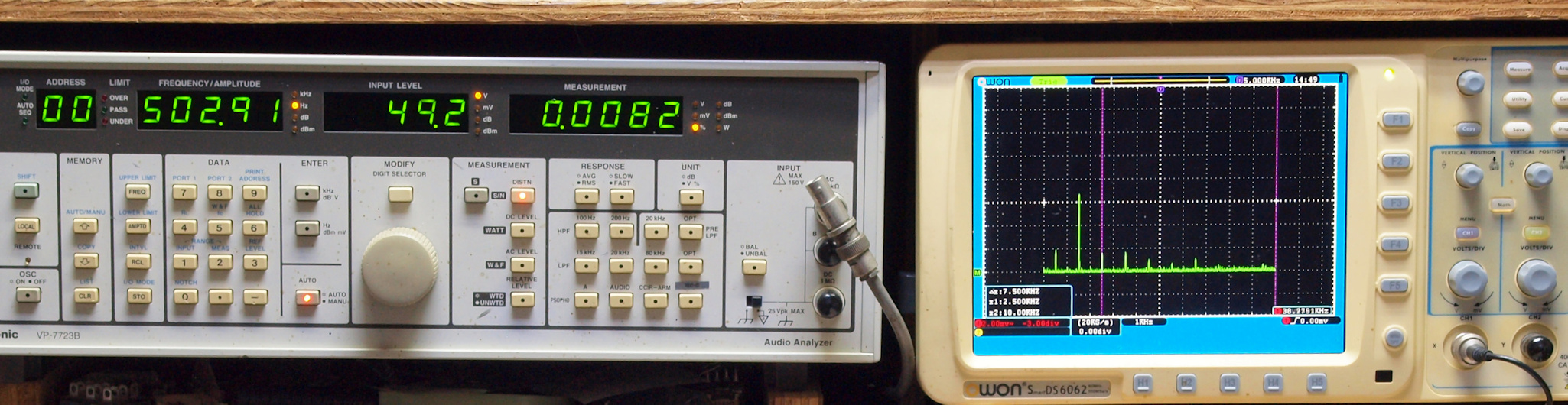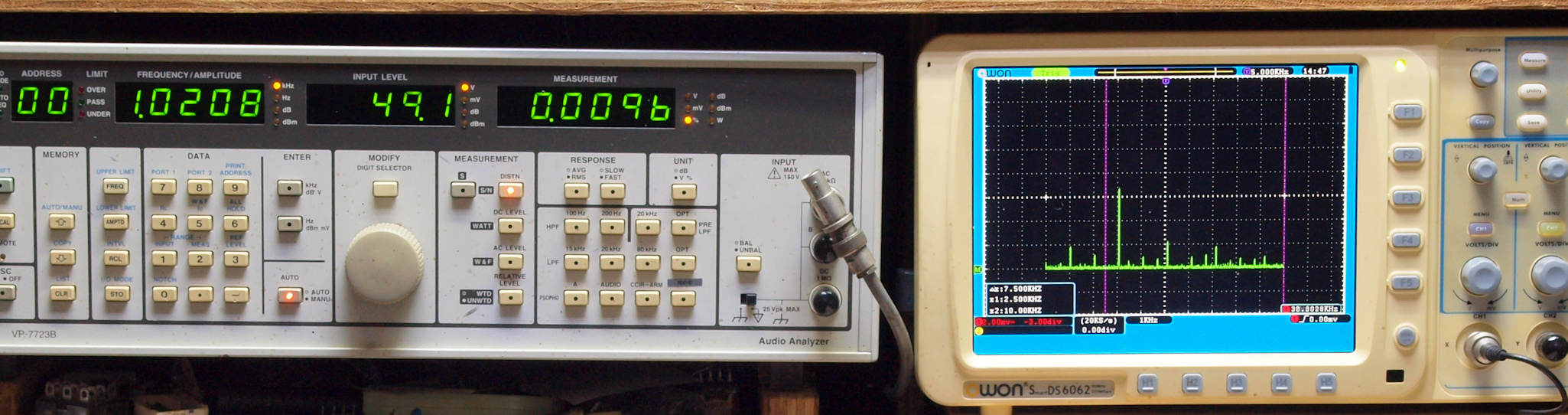 右端 VP−7723Bの基本波除去出力を「owon SDS8202(200MHZ)」で「FFT分析」表示。