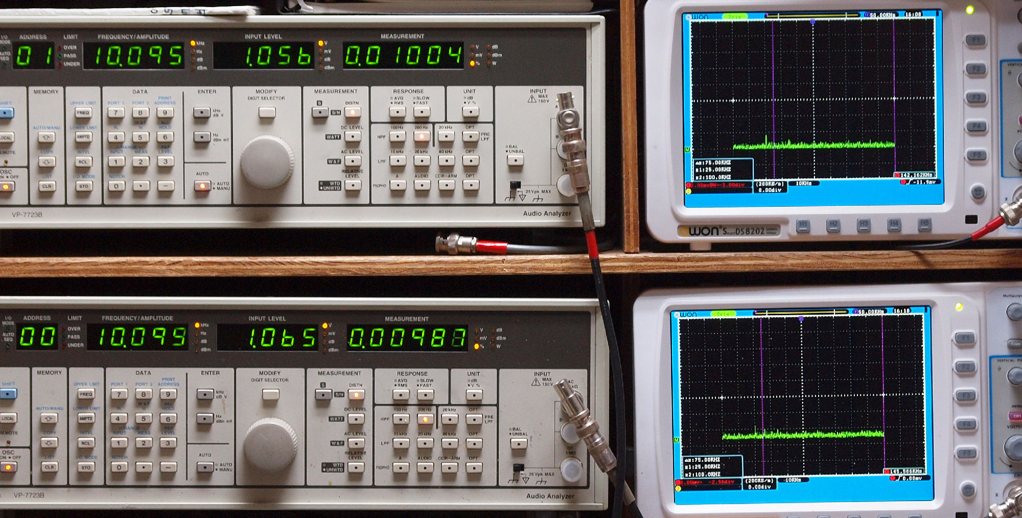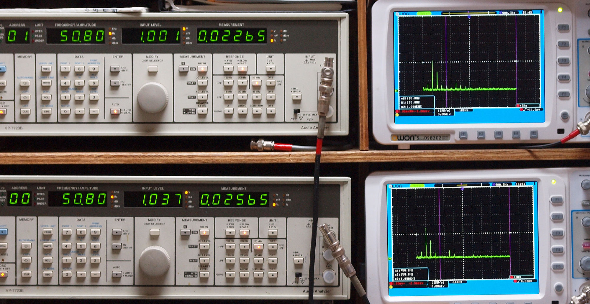 | E. 調整・測定。 画像をクリックすると、大きく(横幅2050ドット)表示されます。 E0. 出力・歪み率測定・調整。 「見方」。 上段中 右側出力を「Audio Analyzer Panasonic VP−7723B」により測定。 表示LED、 左端=メモリーNo、 中左=周波数測定、 中右=出力電圧測定、 右端=歪み率測定。 上段右端 VP−7723Bの基本波除去出力を「owon SDS8202(200MHZ)」で「FFT分析」表示。 下段中 左側出力を「Audio Analyzer Panasonic VP−7723B」により測定。 表示LED、 左端=メモリーNo、 中左=周波数測定、 中右=出力電圧測定、 右端=歪み率測定。 下段右端 VP−7723Bの基本波除去出力を「owon SDS6062(200MHZ)」で「FFT分析」表示。 下段左端 オーディオ発振器 VP−7201A より50Hz〜100kHzの信号を出し(歪み率=約0.003%)、ATT+分配器を通し、AMPに入力。 よって、ダイアル設定出力レベルより低くなります。測定機器の仕様や整備の様子はこちら、「VP−7723B」「VP−7201A」。 FFT画面の見方はこちら。 |