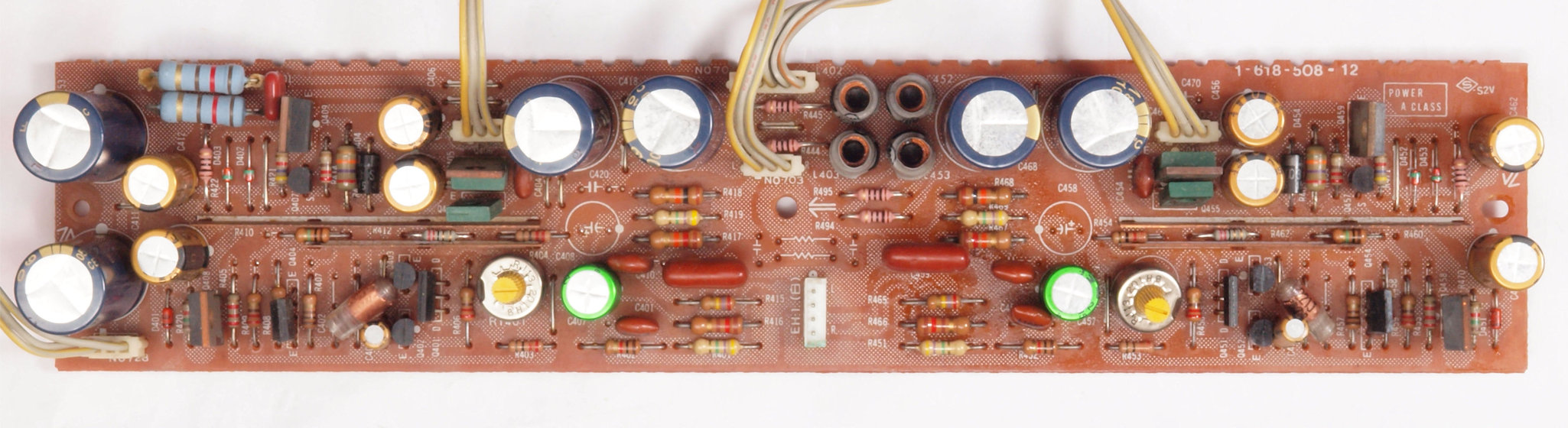 | C22. 修理後 POWER AMP−A基板 複合TR(トランジスター)2個、電解コンデンサ−20個、半固定VR2個、ヒューズ抵抗8個交換。 | ||||||||||||||||||||||||||||||||||||||
