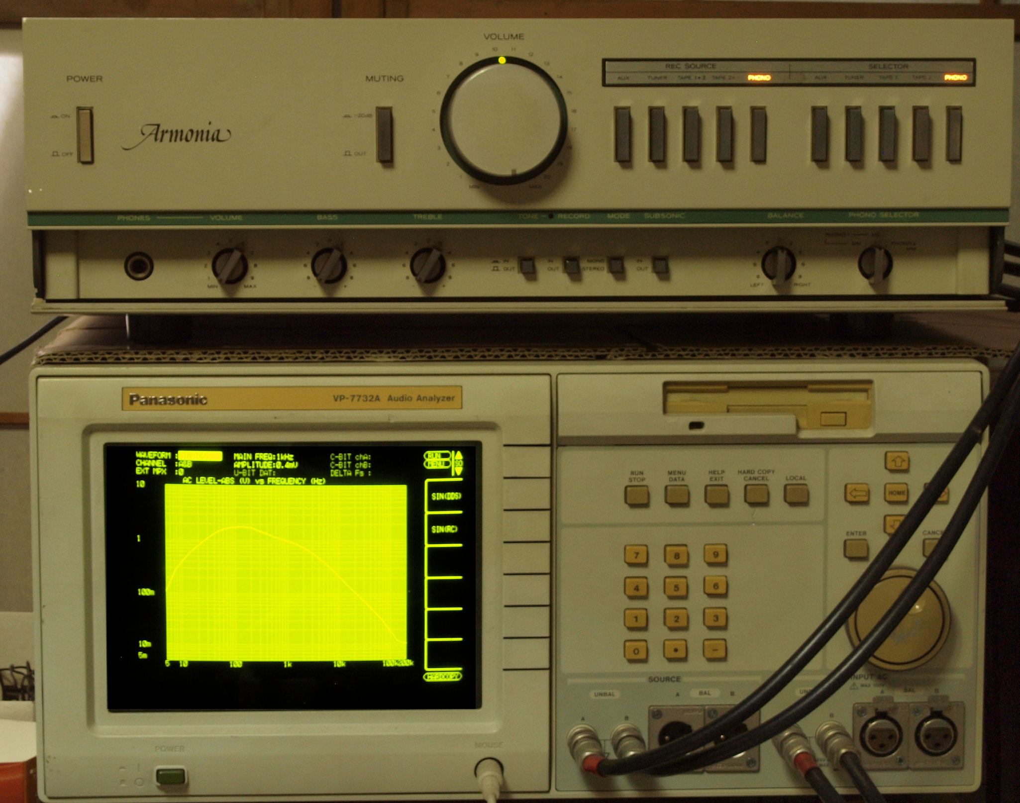 | F. 上位測定器による 調整・測定。 画像をクリックすると、大きく(横幅2050ドット)表示されます。 F0. 下のオーディオアナライザーで自動測定 |