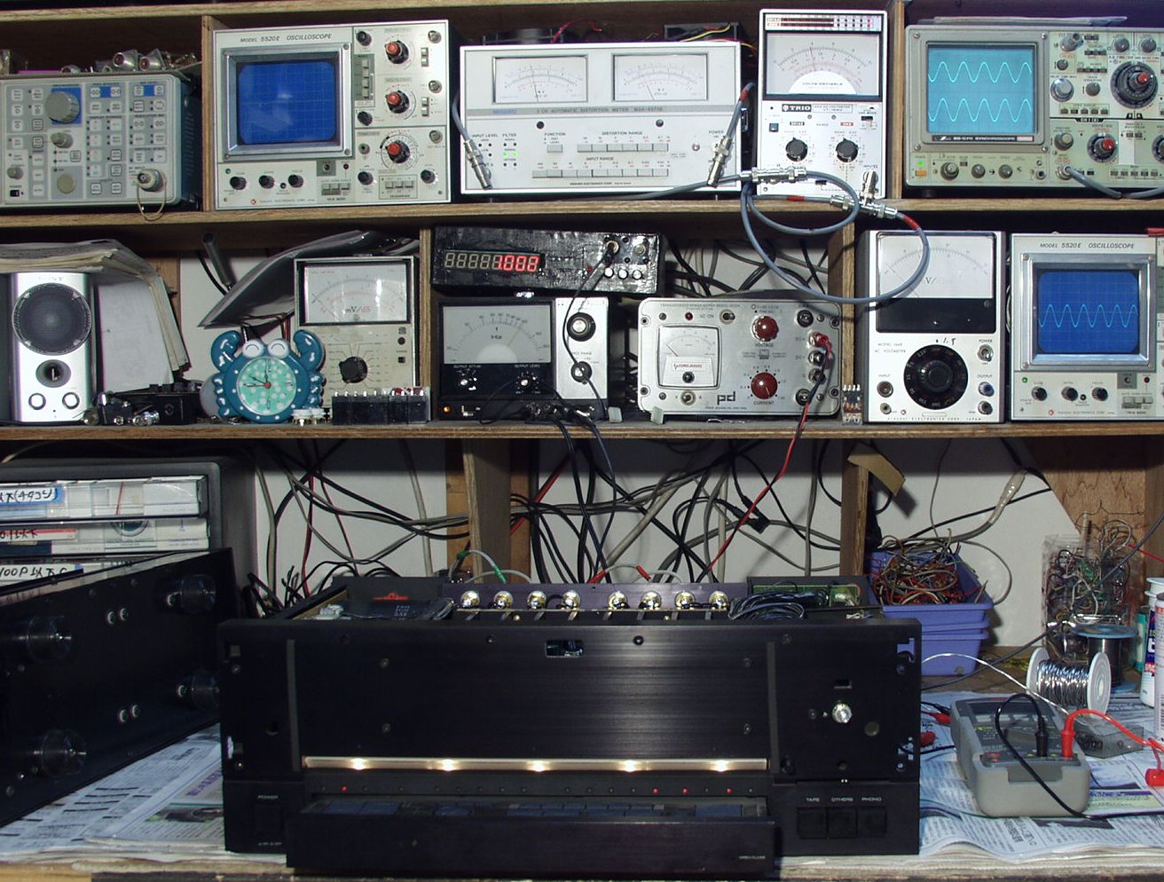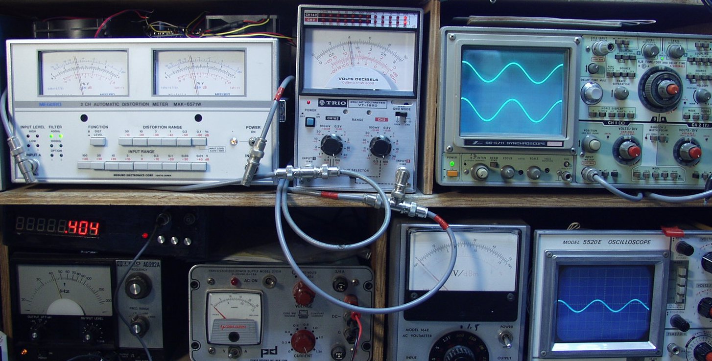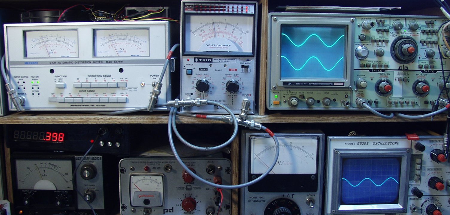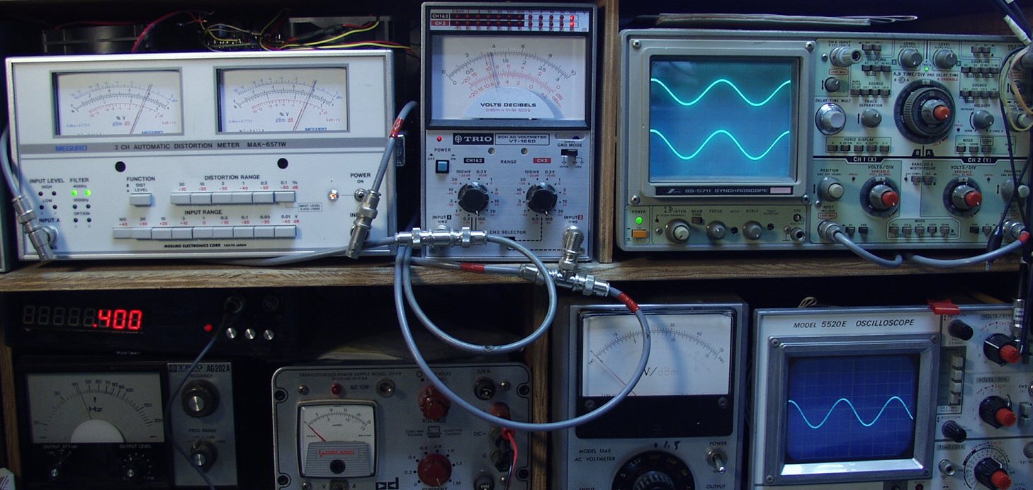 左=歪率計 中=電圧計 右=出力波形 右下=入力波形