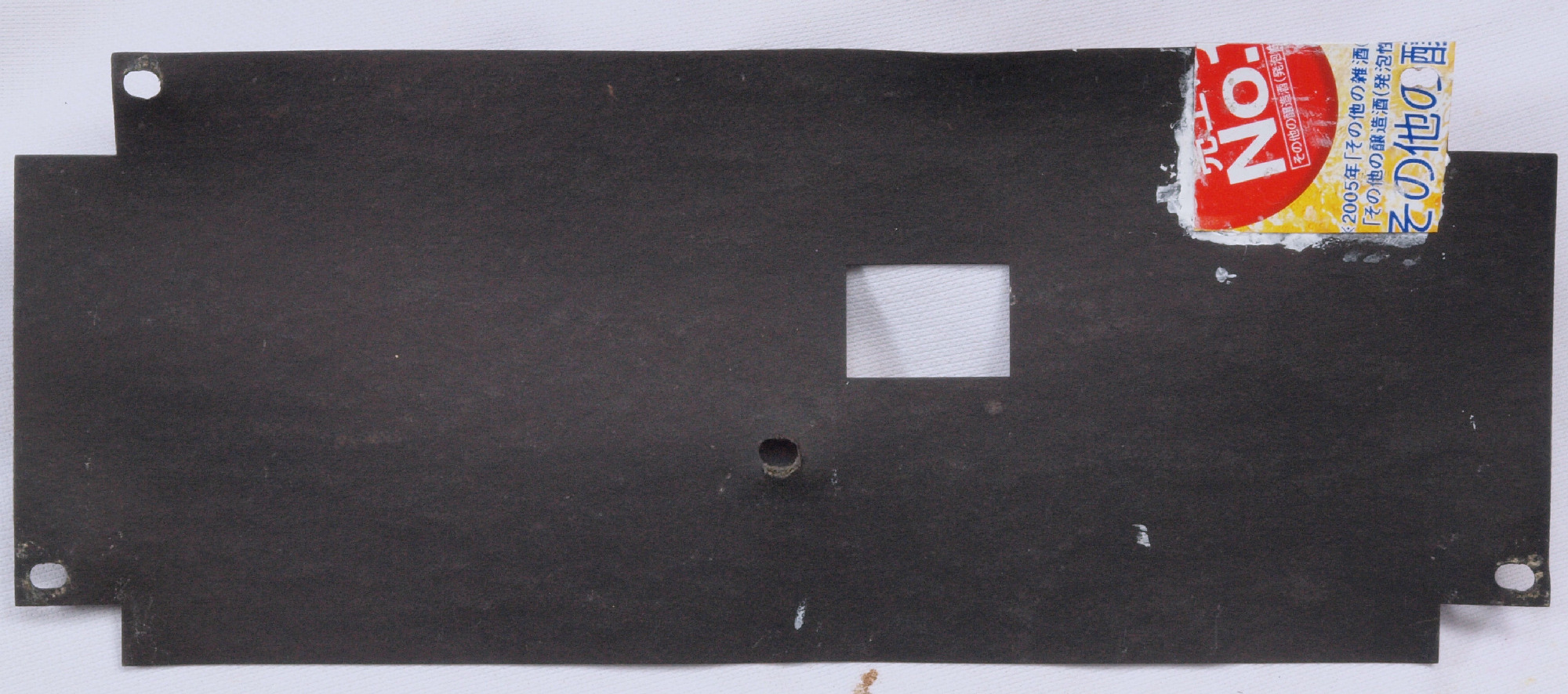 | T. 前後パネル、上下・左右パネル、ビスの塗装。 画像をクリックすると、大きく(横幅2050ドット)表示されます。 T1. 塗装中 電源部上パネル。文字部分をマスキングして塗装後、クリヤースプレーを粒子状に吹き付け、半艶消しにする。 |