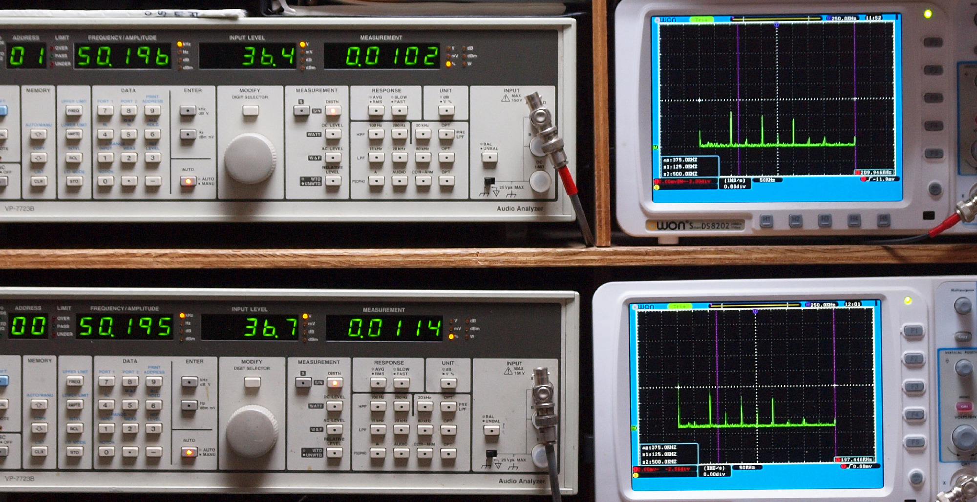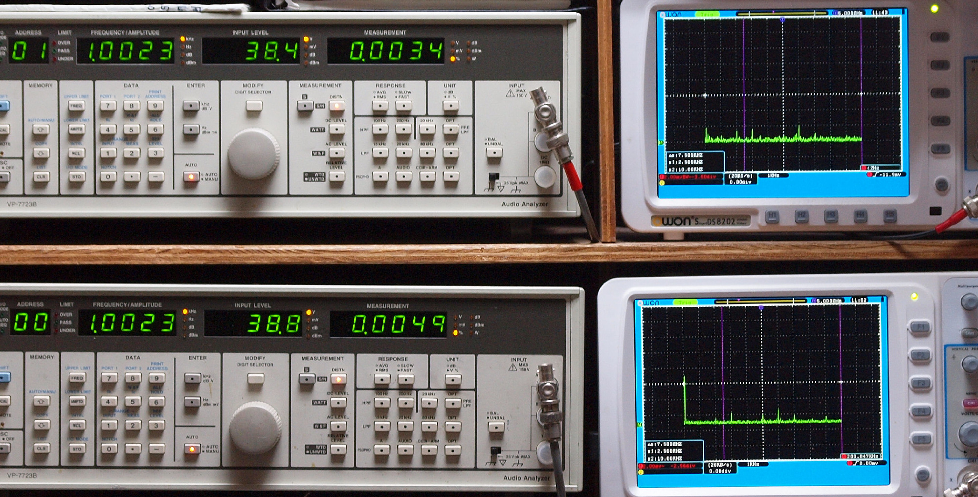 | E. 測定・調整。 画像をクリックすると、大きく(横幅2050ドット)表示されます。 E1. 出力・歪み率測定・調整 「見方」。 上段中 右側SP出力を「Audio Analyzer Panasonic VP−7723B」により測定。 表示LED、 左端=メモリーNo、 中左=周波数測定、 中右=出力電圧測定、 右端=歪み率測定。 上段右端 VP−7723Bの基本波除去出力を「owon SDS8202(200MHZ)」で「FFT分析」表示。 下段中 左側SP出力を「Audio Analyzer Panasonic VP−7723B」により測定。 表示LED、 左端=メモリーNo、 中左=周波数測定、 中右=出力電圧測定、 右端=歪み率測定。 下段右端 VP−7723Bの基本波除去出力を「owon SDS6062(200MHZ)」で「FFT分析」表示。 下段左端 オーディオ発振器 VP−7201A より50Hz〜100kHzの信号を出し(歪み率=約0.003%)、ATT+分配器を通し、AMPに入力。 よって、ダイアル設定出力レベルより低くなります。測定機器の仕様や整備の様子はこちら、「VP−7723B」「VP−7201A」。 FFT画面の見方はこちら。 |
