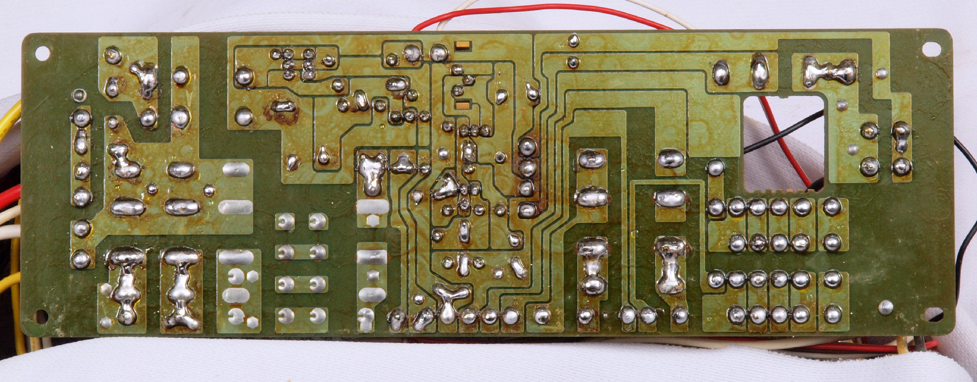 | P5. 修理(半田補正)後 電源部基板裏。 全ての半田をやり直す。 | ||||||||||||||||||||||||||||||||||||||||||||||||