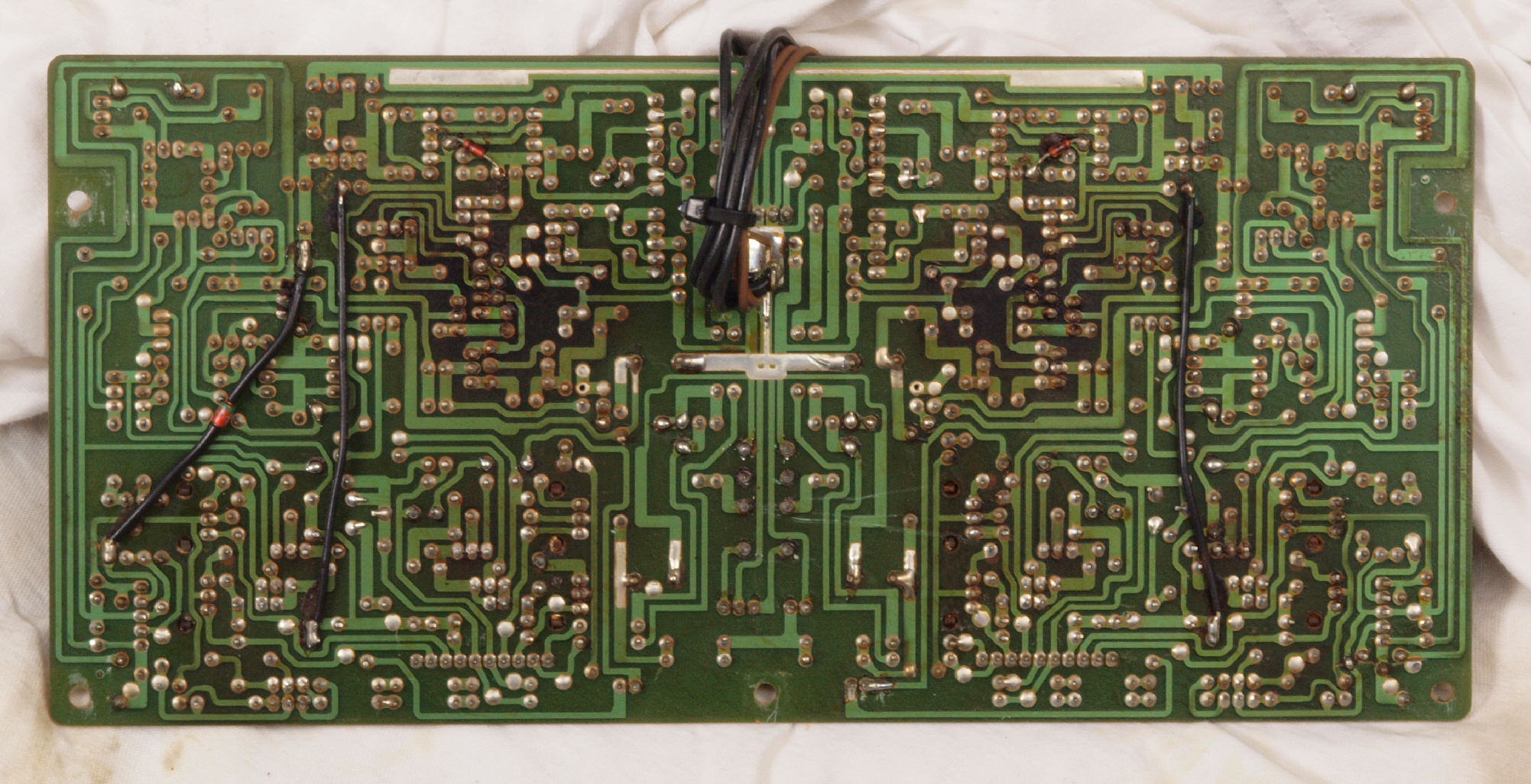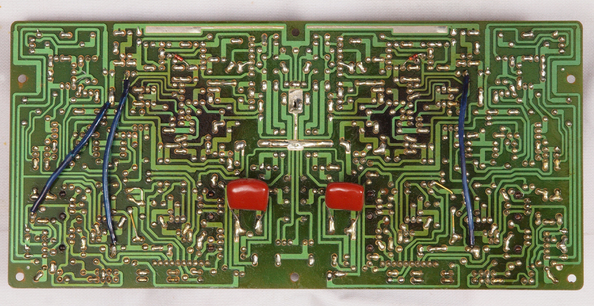 | C54. 修理(半田補正)後 EQ−AMP(equalize-amplifier)基板裏。 さらにコンデンサー6個追加。 半田を全部やり直す。 |