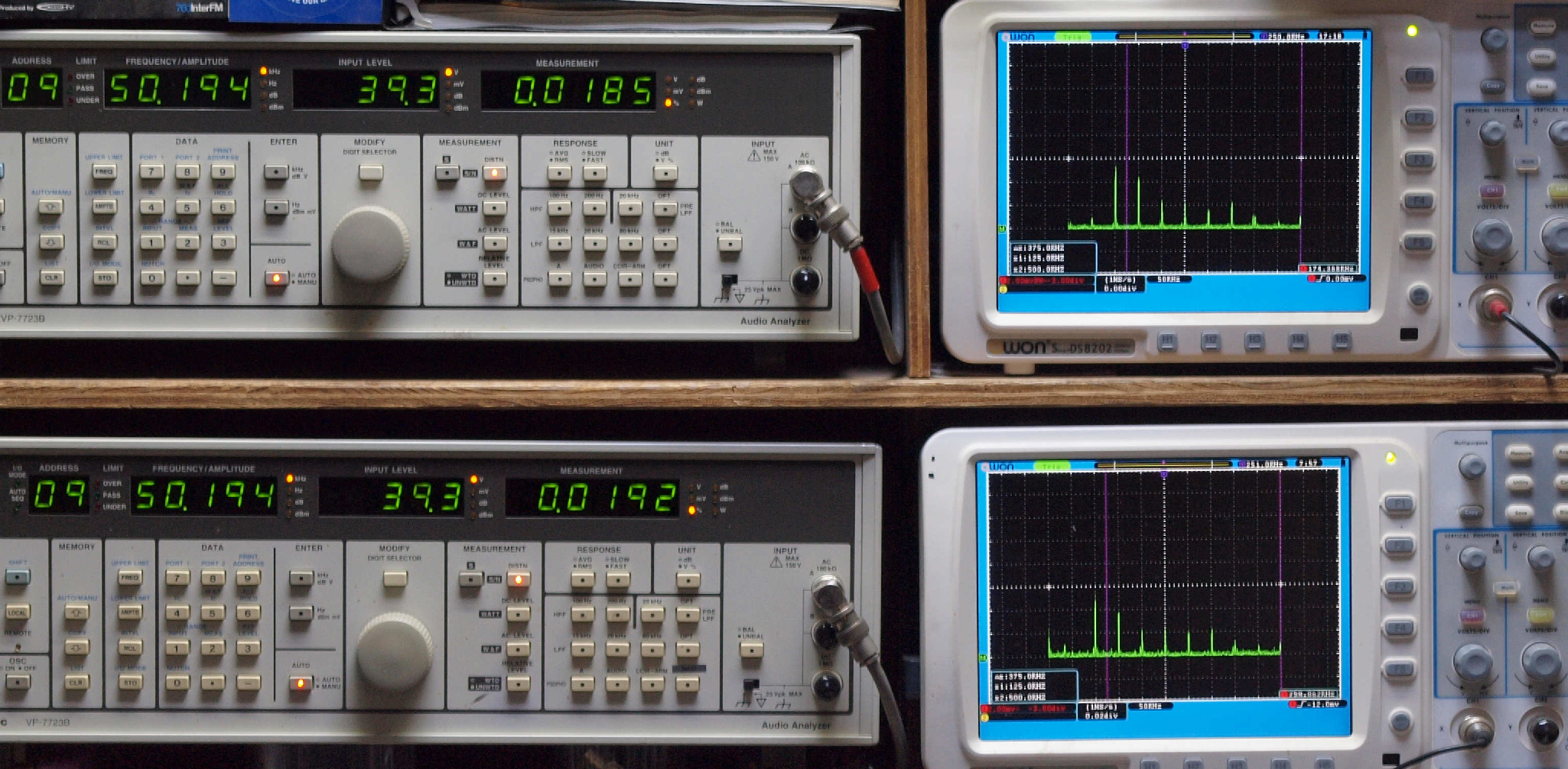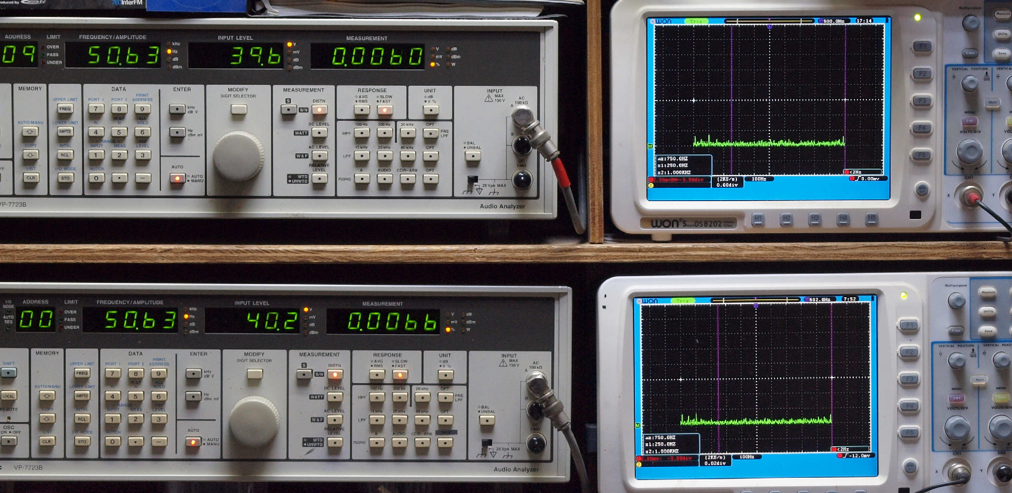 | E. 測定・調整。 画像をクリックすると、大きく(横幅2050ドット)表示されます。 E1. 出力・歪み率測定・調整 「見方」。 上段中 右側SP出力を「Audio Analyzer Panasonic VP−7723B」により測定。 表示LED、 左端=メモリーNo、 中左=周波数測定、 中右=出力電圧測定、 右端=歪み率測定。 上段右端 VP−7723Bの基本波除去出力を「owon SDS8202(200MHZ)」で「FFT分析」表示。 下段中 左側SP出力を「Audio Analyzer Panasonic VP−7723B」により測定。 表示LED、 左端=メモリーNo、 中左=周波数測定、 中右=出力電圧測定、 右端=歪み率測定。 下段右端 VP−7723Bの基本波除去出力を「owon SDS6062(200MHZ)」で「FFT分析」表示。 下段左端 オーディオ発振器 VP−7201A より50Hz〜100kHzの信号を出し(歪み率=約0.003%)、ATT+分配器を通し、AMPに入力。 よって、ダイアル設定出力レベルより低くなります。測定機器の仕様や整備の様子はこちら、「VP−7723B」「VP−7201A」。 FFT画面の見方はこちら。 |