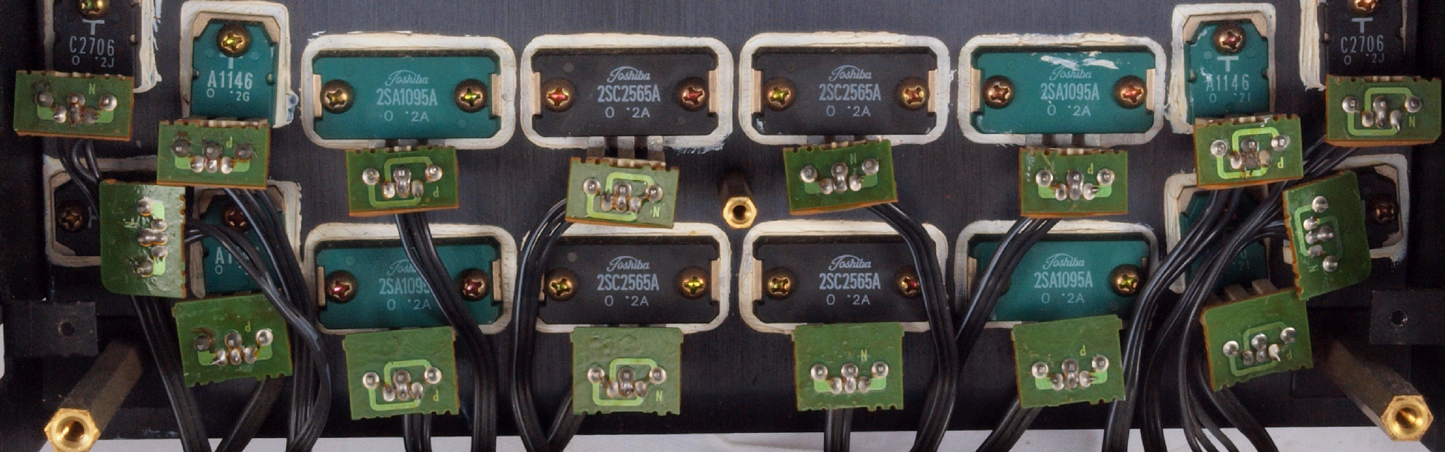 | A42. 点検中 交換する終段TR(トランジスター)の選別。 後発のサンケンの音響用パワートランジスタ(LAPT) 2SA1295/2SC3264を使用。 増幅率hfeを測定し、hfe=82/81を選別使用する。hfe=83は L−02A. 16台目で使用済み。 LAPT(Linear Amplification Power Transistor)は、マルチエミッタ構造で高周波数までリニアに増幅できるオーディオ用TR(トランジスター)。 純銅材を採用しており、ボンディングワイヤーまで徹底非磁性化することで磁気歪の発生を排除し、遮断周波数を大幅改善し、広帯域化と、電流増幅率のリニアリティとスイッチング特性向上させている。 |