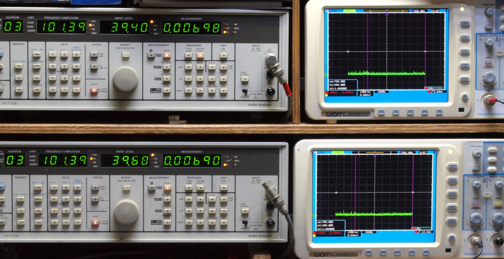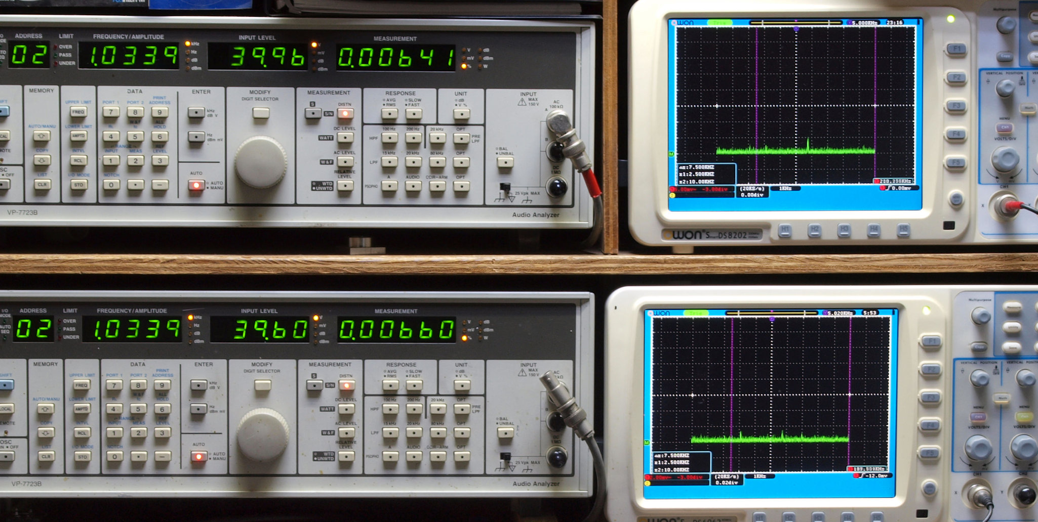 | E. 測定・調整。 画像をクリックすると、大きく(横幅2050ドット)表示されます。 E1. 出力・歪み率測定・調整 「見方」。 上段中 右側SP出力を「Audio Analyzer Panasonic VP−7723B」により測定。 表示LED、 左端=メモリーNo、 中左=周波数測定、 中右=出力電圧測定、 右端=歪み率測定。 上段右端 VP−7723Bの基本波除去出力を「owon SDS8202(200MHZ)」で「FFT分析」表示。 下段中 左側SP出力を「Audio Analyzer Panasonic VP−7723B」により測定。 表示LED、 左端=メモリーNo、 中左=周波数測定、 中右=出力電圧測定、 右端=歪み率測定。 下段右端 VP−7723Bの基本波除去出力を「owon SDS6062(200MHZ)」で「FFT分析」表示。 下段左端 オーディオ発振器 VP−7201A より50Hz〜100kHzの信号を出し(歪み率=約0.003%)、ATT+分配器を通し、AMPに入力。 よって、ダイアル設定出力レベルより低くなります。測定機器の仕様や整備の様子はこちら、「VP−7723B」「VP−7201A」。 FFT画面の見方はこちら。 |