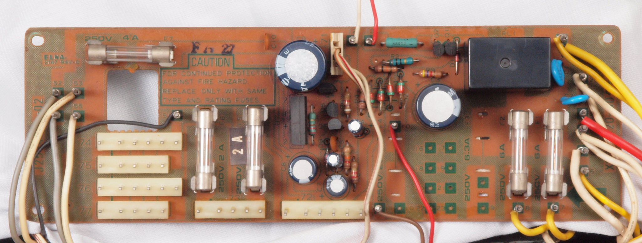 | P3. 修理後 電源部基板。 電解コンデンサー6個、リレー1個、整流ブリッジ1個、TR(トランジスター)1個交換 | ||||||||||||||||||||||||||||||||||||||||||||||||