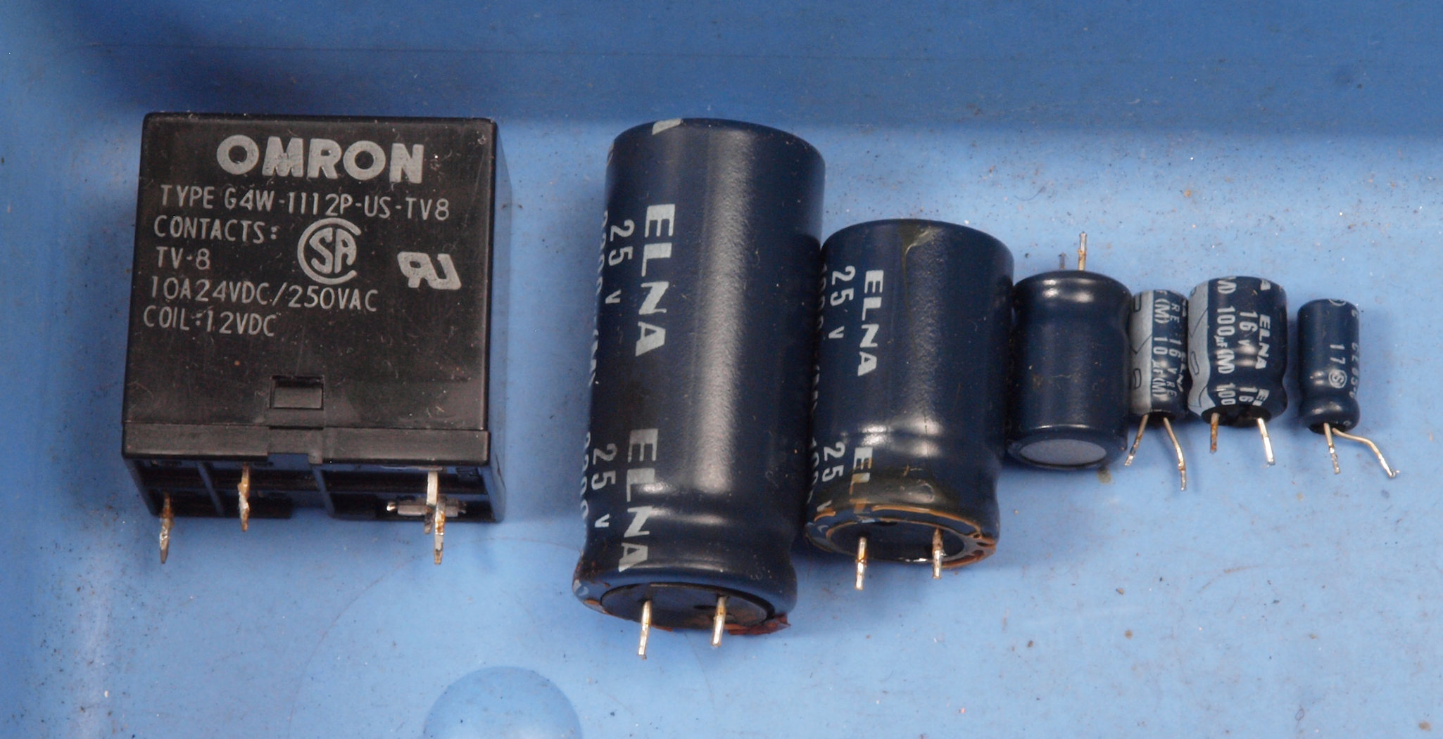 | A91. 点検中 交換する電源投入リレーの比較。 左=付いている物(1a=10A)、 右=交換する物で、2倍の容量を持つ(2a=10A×2) パラ(W)接点となり、片側がアークを引き受けるので、もう片方は接点消耗が無に近い 但し、足数が増すので、基板の加工が必要となる。 |