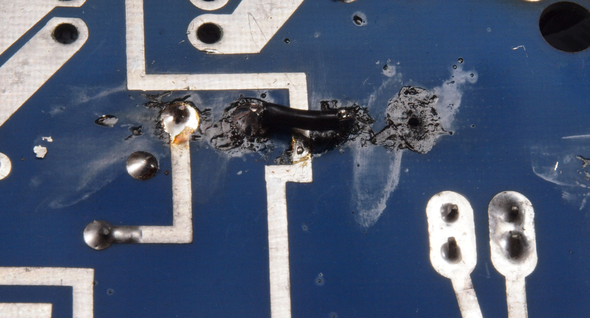 | C322. 修理中 電源基板裏。 交換した電解コンデンサーの交換の液漏れ跡。左の2個1台目の物と比較する。 | ||||||||||||||||||||||