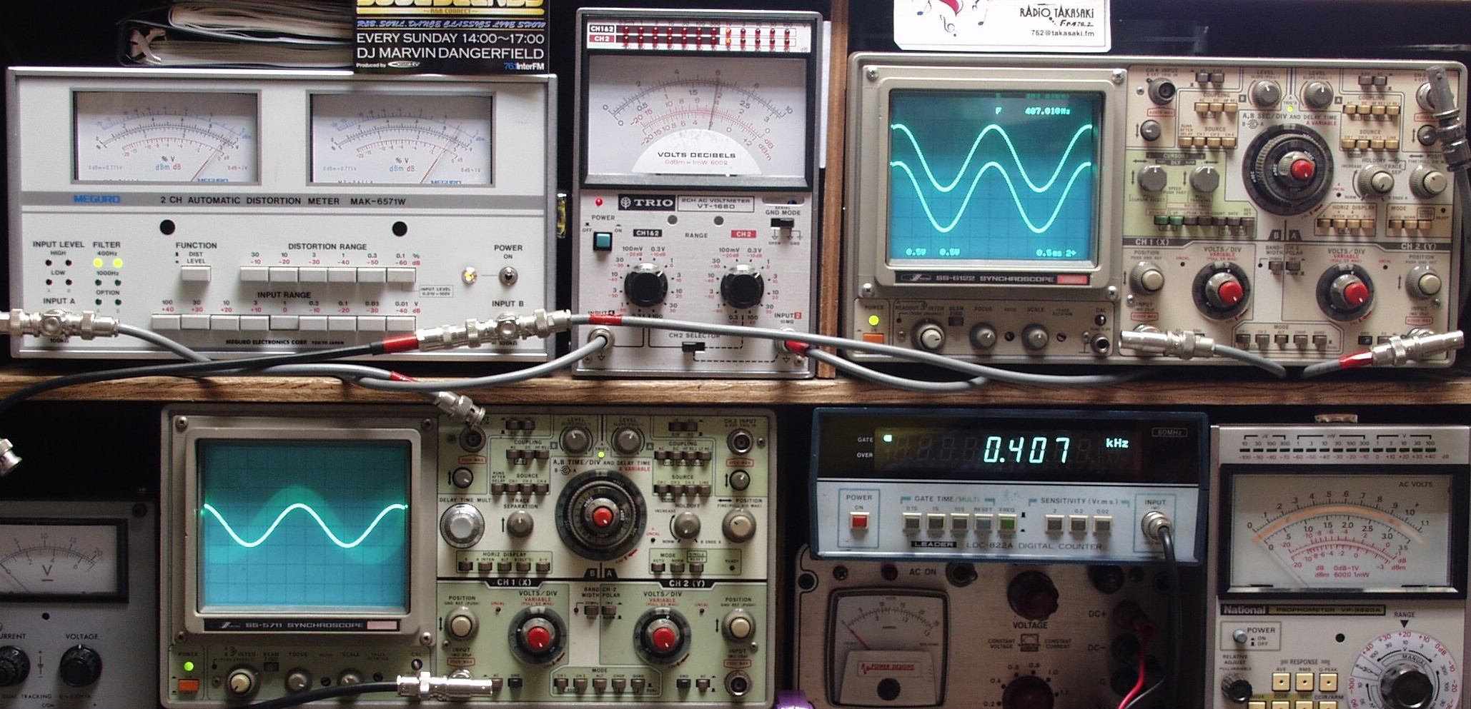 | E. 調整・測定 E1.調整・出力測定 <見方> 上左オーデオ発振器より400HZ・1KHZの信号を出す(歪み率=約0.003%) 下中=入力波形(オーデオ発振器のTTLレベル) 下右=周波数計 上左=SP出力の歪み率測定 左メ−タ−=L出力、右メ−タ−=R出力 上中=SP出力電圧測定器、赤針=R出力、黒針=L出力 上右=SP出力波形オシロ 上=R出力、下=L出力(出力電圧測定器の出力) |