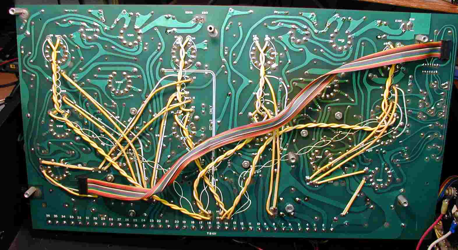 3.基板裏、スルフォ−ル基板、黄色の撚り配線はヒ−タ配線、半田補正10ヶ所。