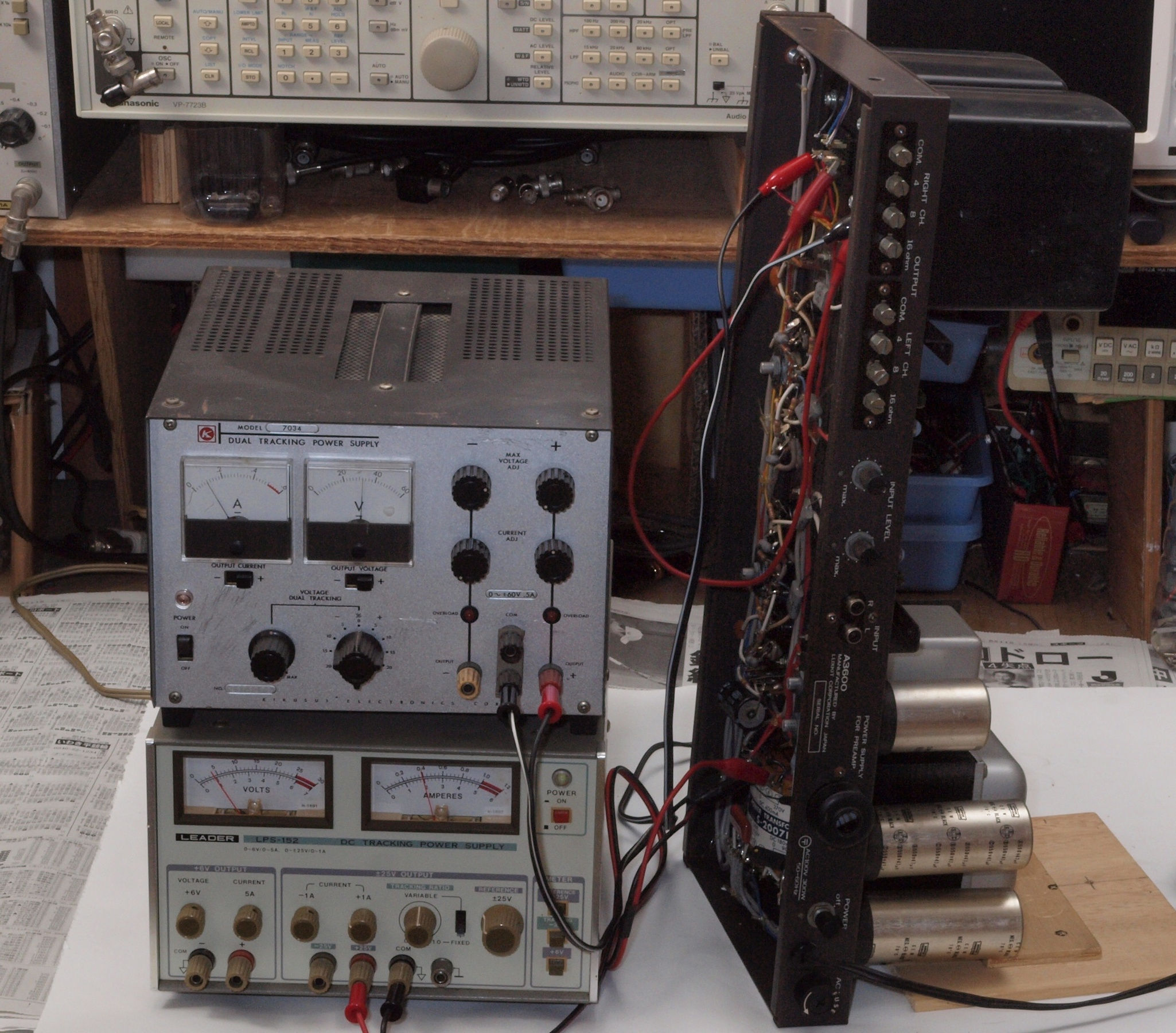 | E. 測定・調整。 画像をクリックすると、大きく(横幅2050ドット)表示されます。 E1. 出力・歪み率測定・調整 「見方」。 上段中 右側SP出力を「Audio Analyzer Panasonic VP−7723B」により測定。 表示LED、 左端=メモリーNo、 中左=周波数測定、 中右=出力電圧測定、 右端=歪み率測定。 上段右端 VP−7723Bの基本波除去出力を「owon SDS8202(200MHZ)」で「FFT分析」表示。 下段中 左側SP出力を「Audio Analyzer Panasonic VP−7723B」により測定。 表示LED、 左端=メモリーNo、 中左=周波数測定、 中右=出力電圧測定、 右端=歪み率測定。 下段右端 VP−7723Bの基本波除去出力を「owon SDS6062(200MHZ)」で「FFT分析」表示。 下段左端 オーディオ発振器 VP−7201A より50Hz〜100kHzの信号を出し(歪み率=約0.003%)、ATT+分配器を通し、AMPに入力。 よって、ダイアル設定出力レベルより低くなります。測定機器の仕様や整備の様子はこちら、「VP−7723B」「VP−7201A」。 FFT画面の見方はこちら。 |