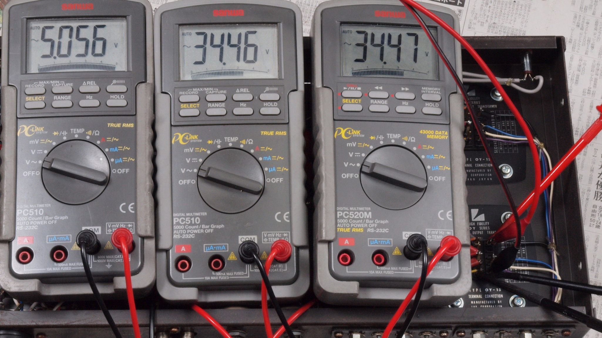 | L11. 点検中 右側出力トランス電圧測定。 16Ω端子にAC5V/1kHzを入力し、1次巻き線P1−B1間電圧=34.46V、P2−B2間電圧=34.47V。 |