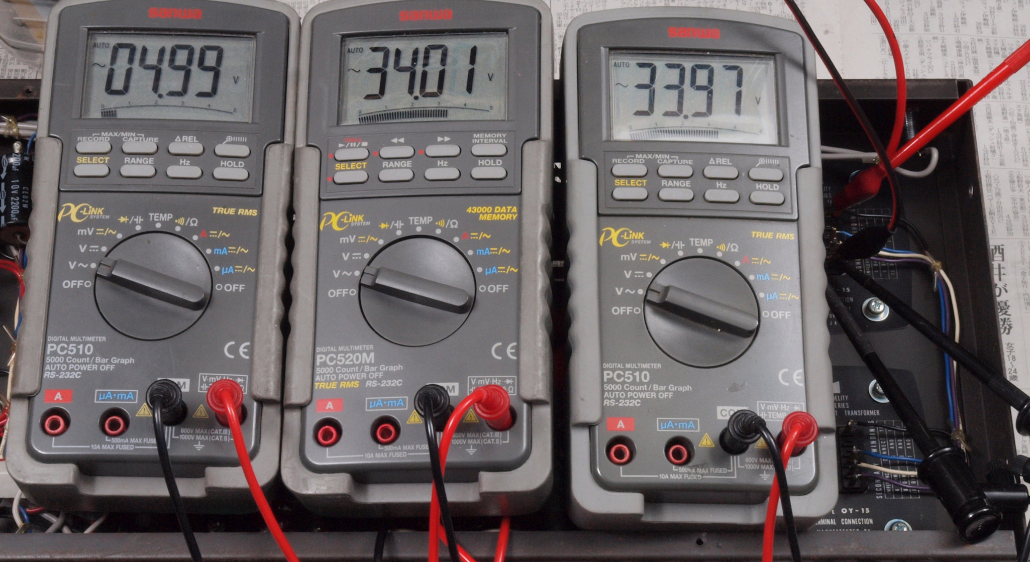 | L11. 点検中 左側出力トランス電圧測定。 16Ω端子にAC5V/1kHzを入力し、1次巻き線P1−B1間電圧=34.01V、P2−B2間電圧=33.97V。 |