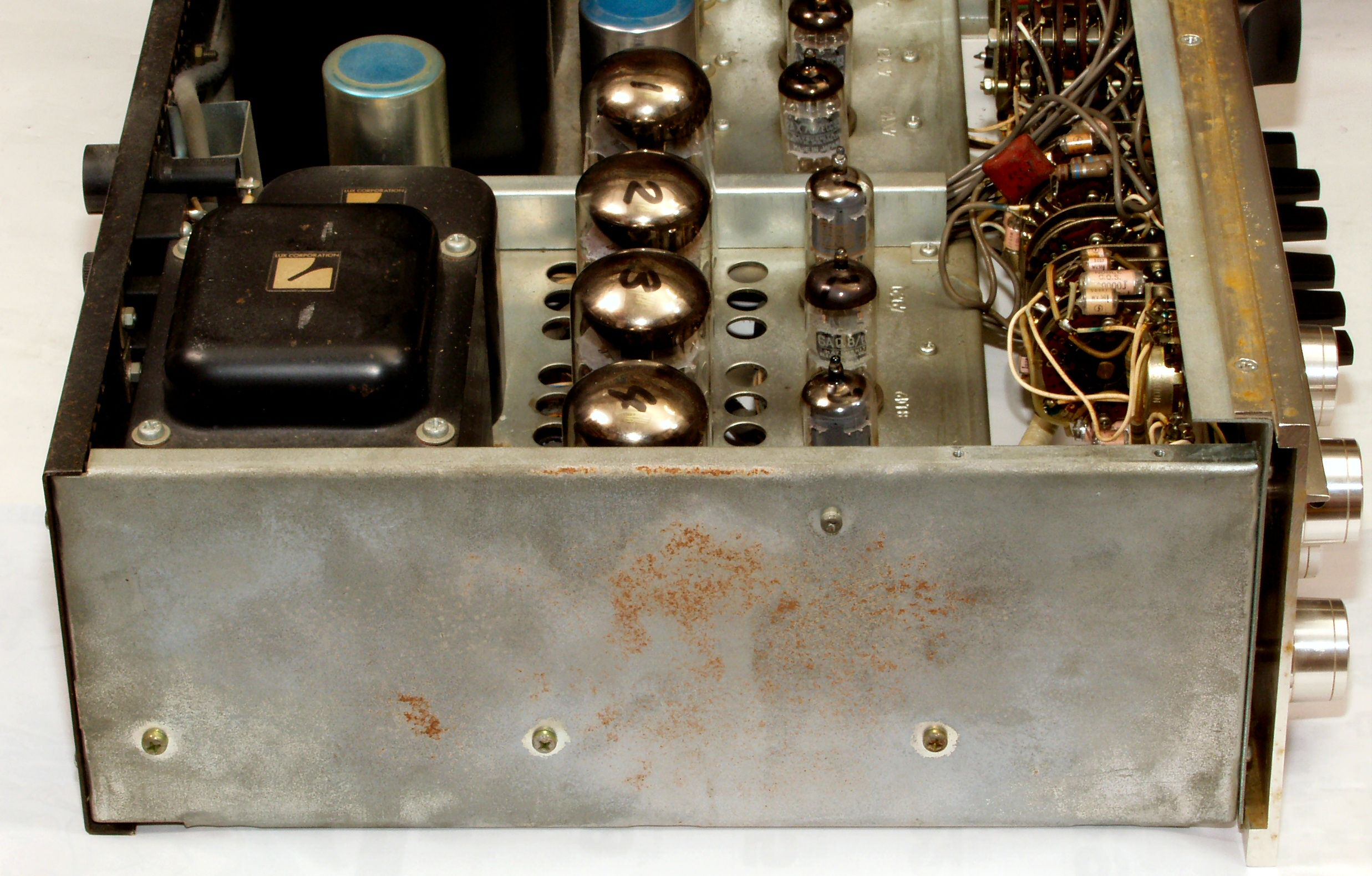 | A2C. 点検中 木箱から出し、左横から見る。 暖房によると見られる、露結による錆びが発生している。 使用しないときは、タオル等を掛けておくと防止出来ます。 AMPの故障予防方法参照 |