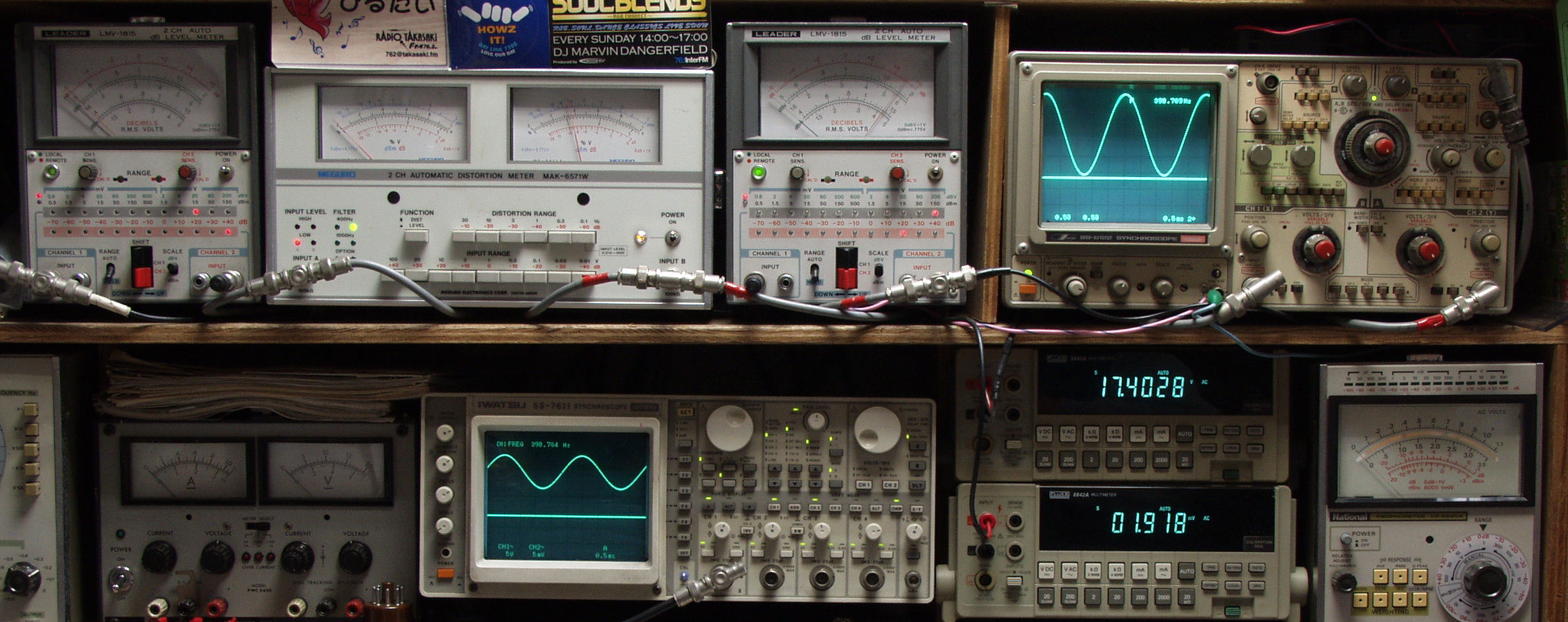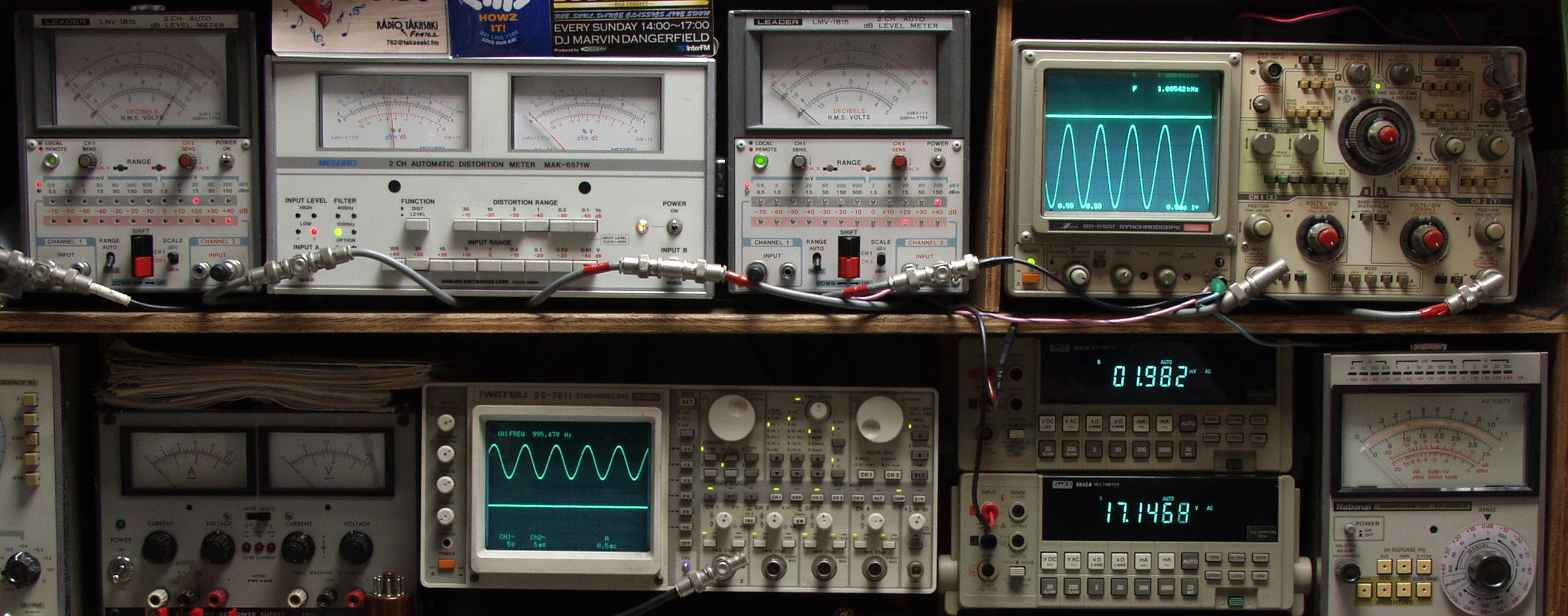 | E. 調整・測定 E1. 出力・歪み率測定・調整 <見方> 下段左端 オーディオ発振器より400HZ・1KHZの信号を出し(歪み率=約0.003%)これをAMPに入力し、出力を測定 下段中左 オシロ=入力波形(オーディオ発振器のTTLレベル) 下段中右上=周波数計 上段左端 電圧計=L側出力電圧測定、黒針のみ使用 上段中左 歪み率計=出力の歪み率測定 左メータ=L出力、右メータ=R出力 上段中右 電圧計=R側出力電圧測定、赤針のみ使用 上段右端 オシロ=出力波形 上=R出力、下=L出力(実際にはRL電圧計の出力「Max1V」を観測) 下段中右上 デジタル電圧計=R出力電圧測定 下段中右下 デジタル電圧計=L出力電圧測定 |