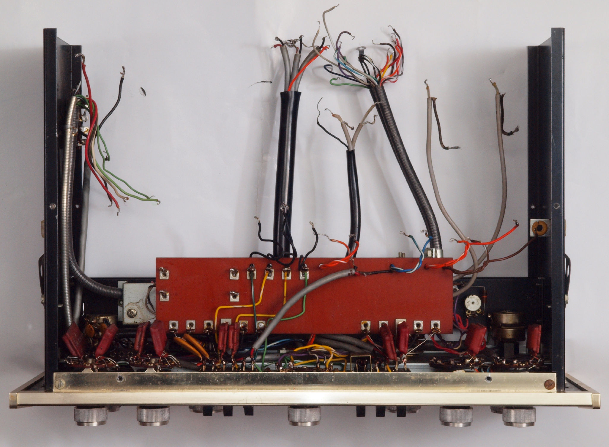 C12. 修理中 真空管基板、電源シャシ、前パネルを外して修理する。 下から見る。