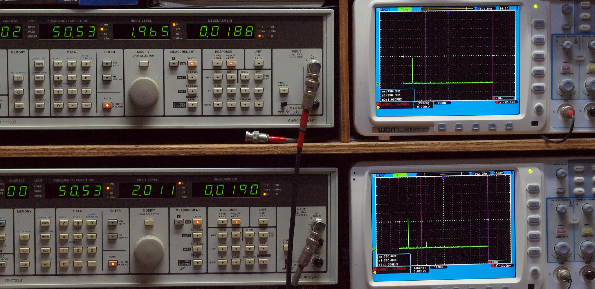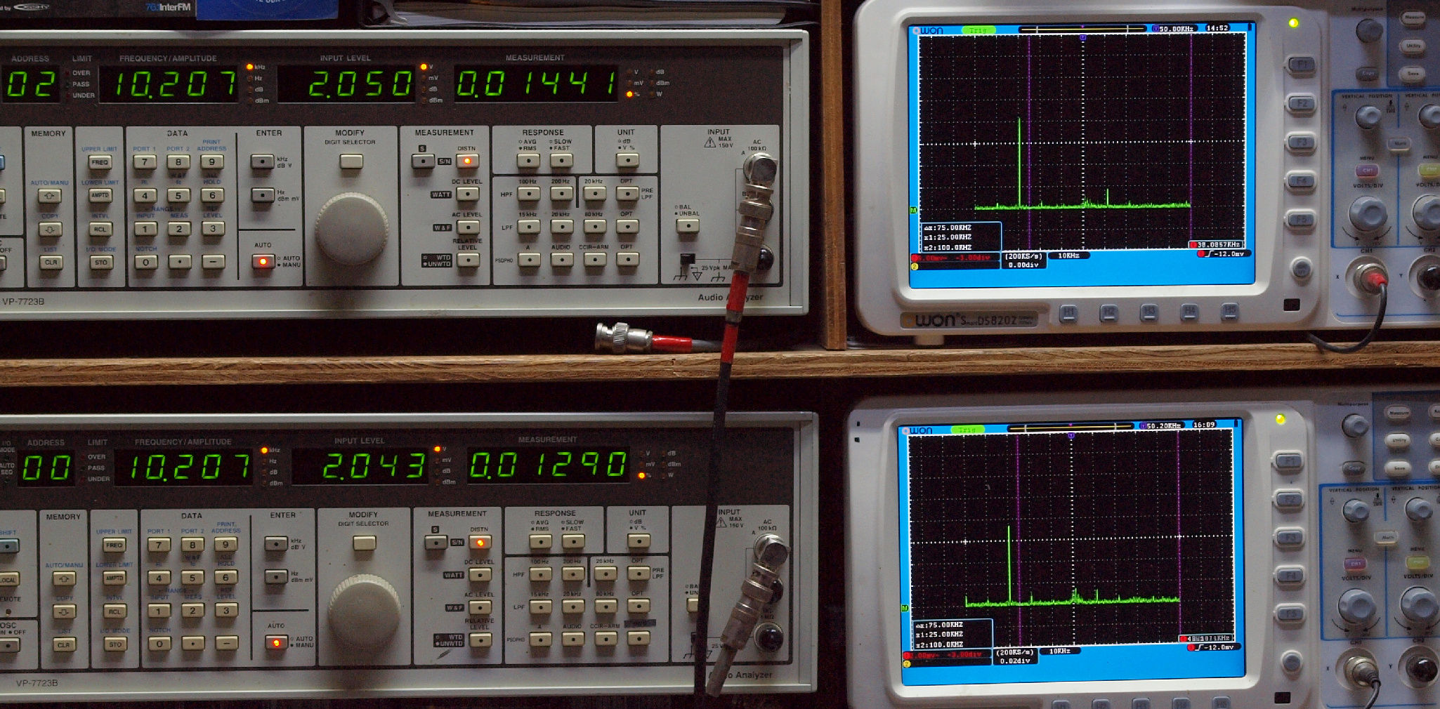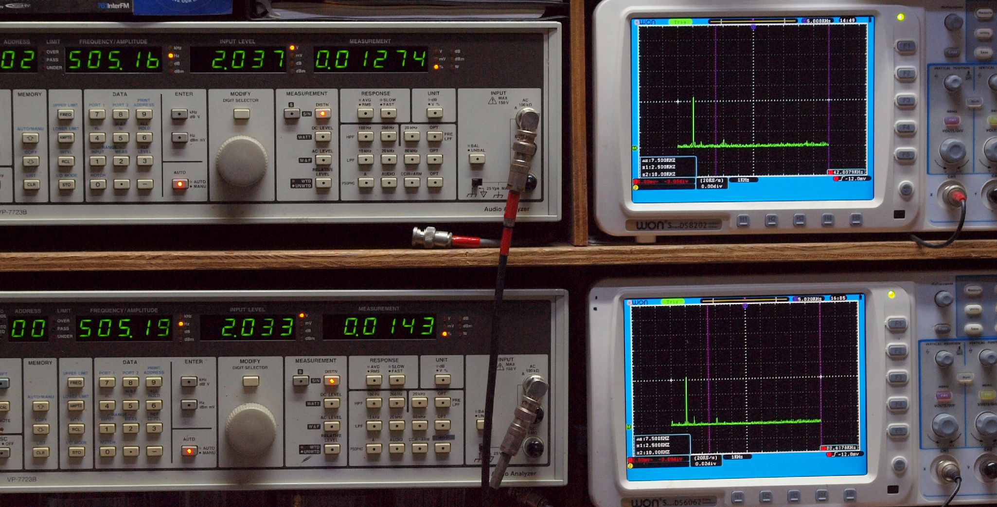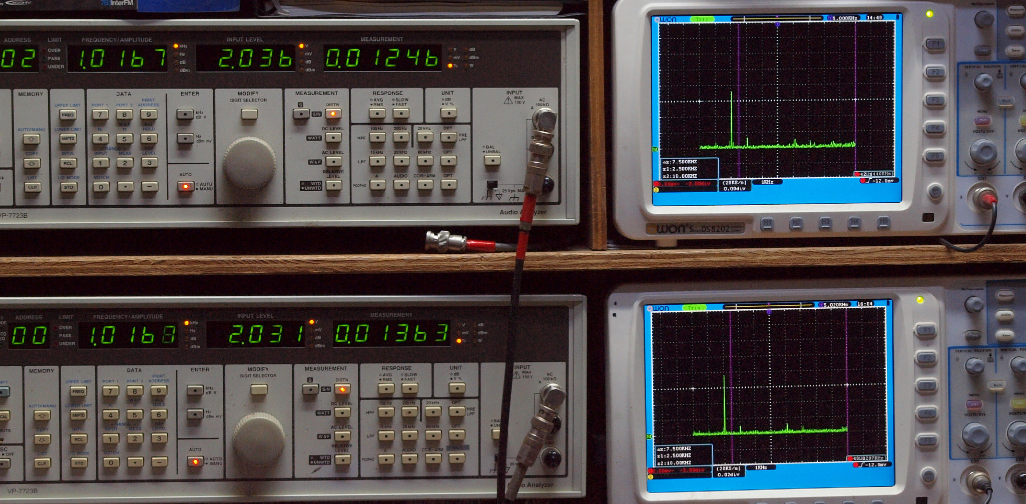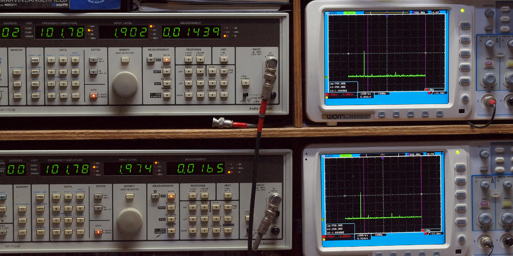 上段右端 VP−7723Bの基本波除去出力を「owon SDS8202(200MHZ)」で「FFT分析」表示。