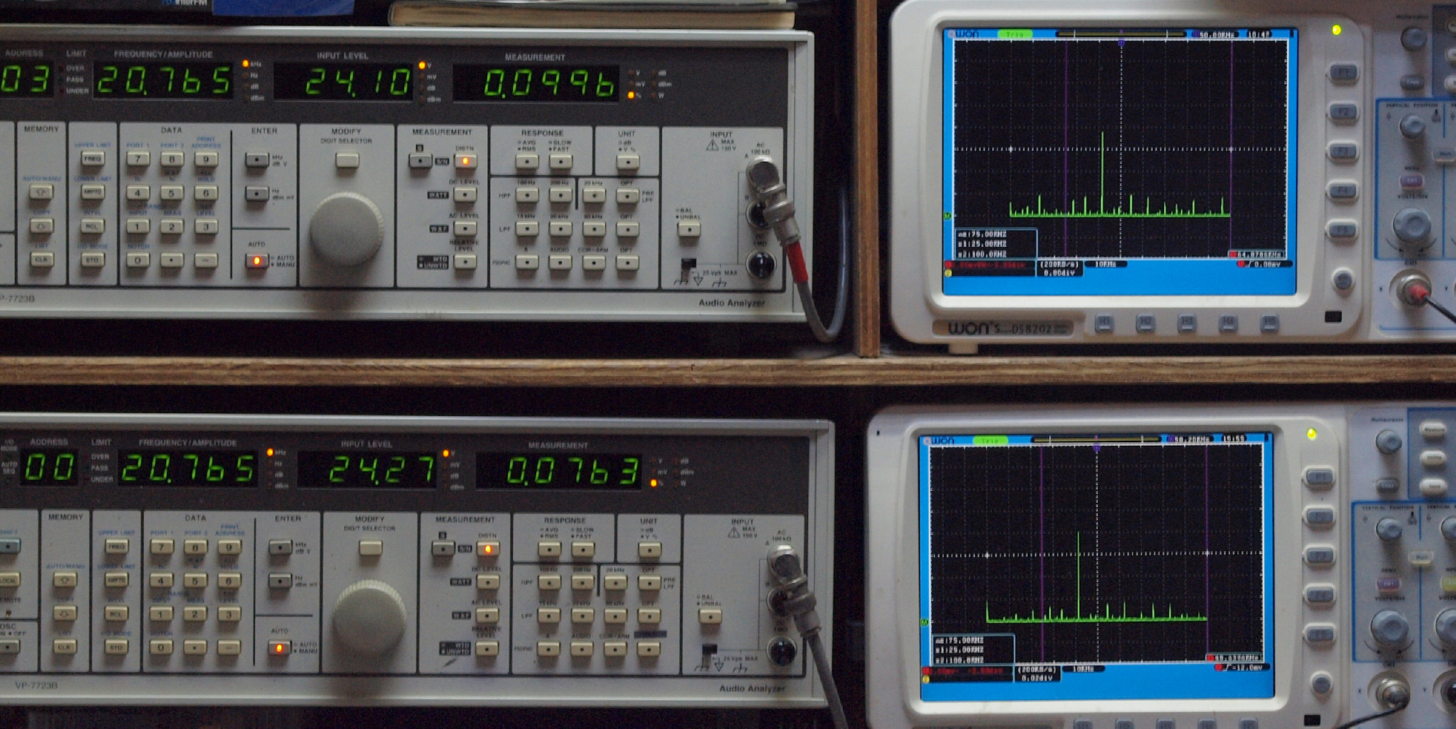| E. 修理後の測定・調整。 画像をクリックすると、大きく(横幅2050ドット)表示されます。 E0. 出力・歪み率測定・調整、 100Vで測定。 「見方」。 上段中 右側SP出力を「Audio Analyzer Panasonic VP−7723B」により測定。 表示LED、 左端=メモリーNo、 中左=周波数測定、 中右=出力電圧測定、 右端=歪み率測定。 上段右端 VP−7723Bの基本波除去出力を「owon SDS8202(200MHZ)」で「FFT分析」表示。 下段中 左側SP出力を「Audio Analyzer Panasonic VP−7723B」により測定。 表示LED、 左端=メモリーNo、 中左=周波数測定、 中右=出力電圧測定、 右端=歪み率測定。 下段右端 VP−7723Bの基本波除去出力を「owon SDS6062(200MHZ)」で「FFT分析」表示。 下段左端 オーディオ発振器 VP−7201A より50Hz〜100kHzの信号を出し(歪み率=約0.003%)、ATT+分配器を通し、AMPに入力。 よって、ダイアル設定出力レベルより低くなります。測定機器の仕様や整備の様子はこちら、「VP−7723B」「VP−7201A」。 FFT画面の見方はこちら。 |
