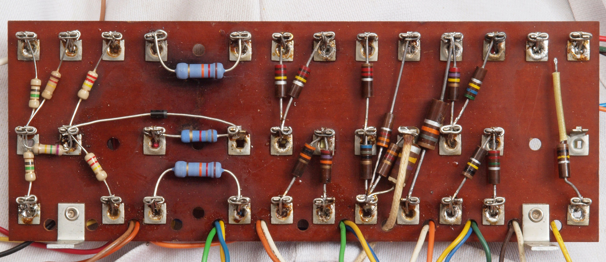| C34. 修理後 基板裏、何回も修理したので、引き出し線は短くなり、巻き付けではなく差し込み半田なので、 全引き出し線を交換して、巻き付けする。 整流ダイオード個、抵抗9個交換。 |