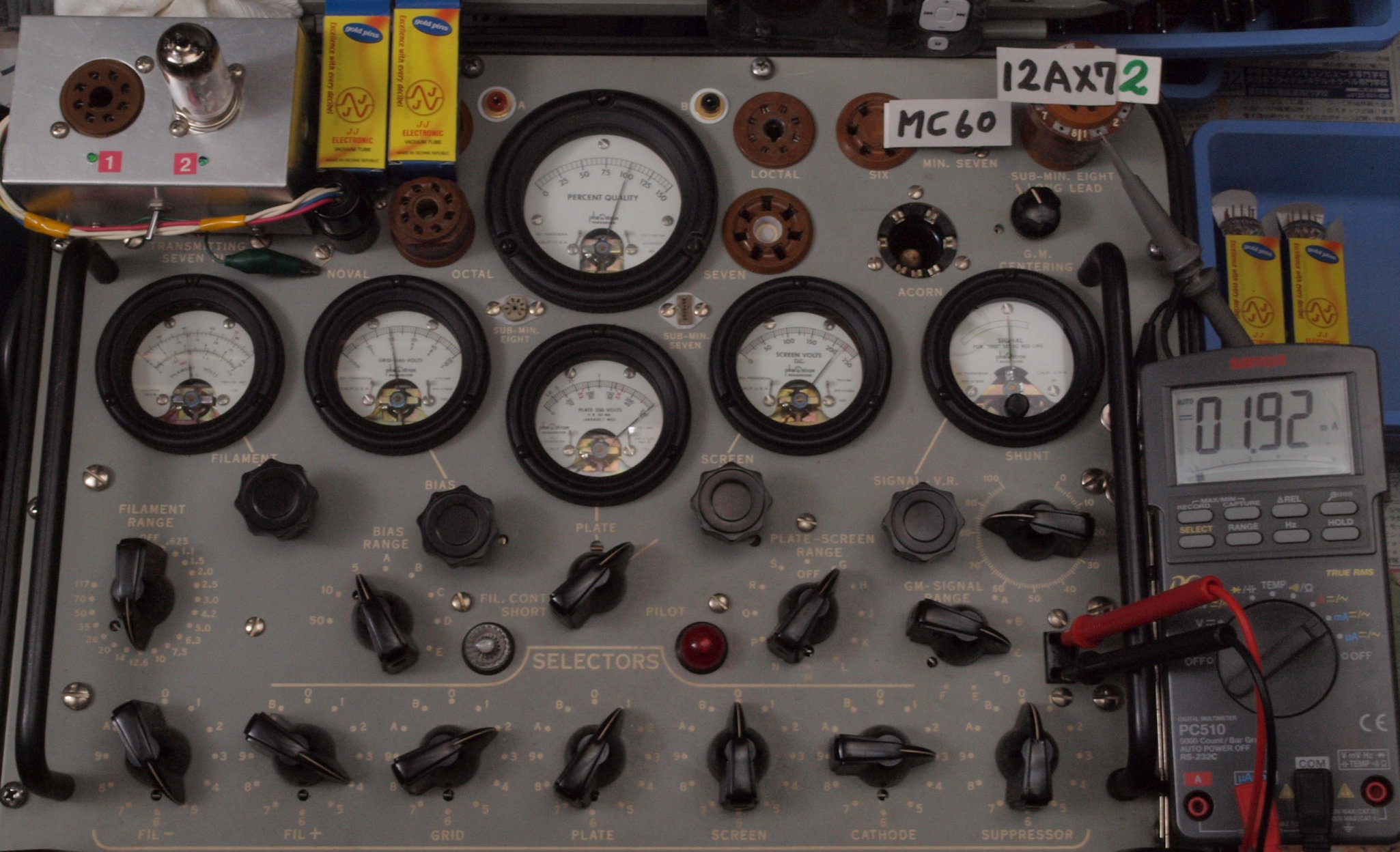 | V61. 購入真空管ECC803S 2本目ユニット1。 Gm測定=2000μmho、Ip=1.92mA。 測定条件、「Ep=250V、Eg1=−2」、 Cレンジ=3000μmhoレンジでの測定。 |