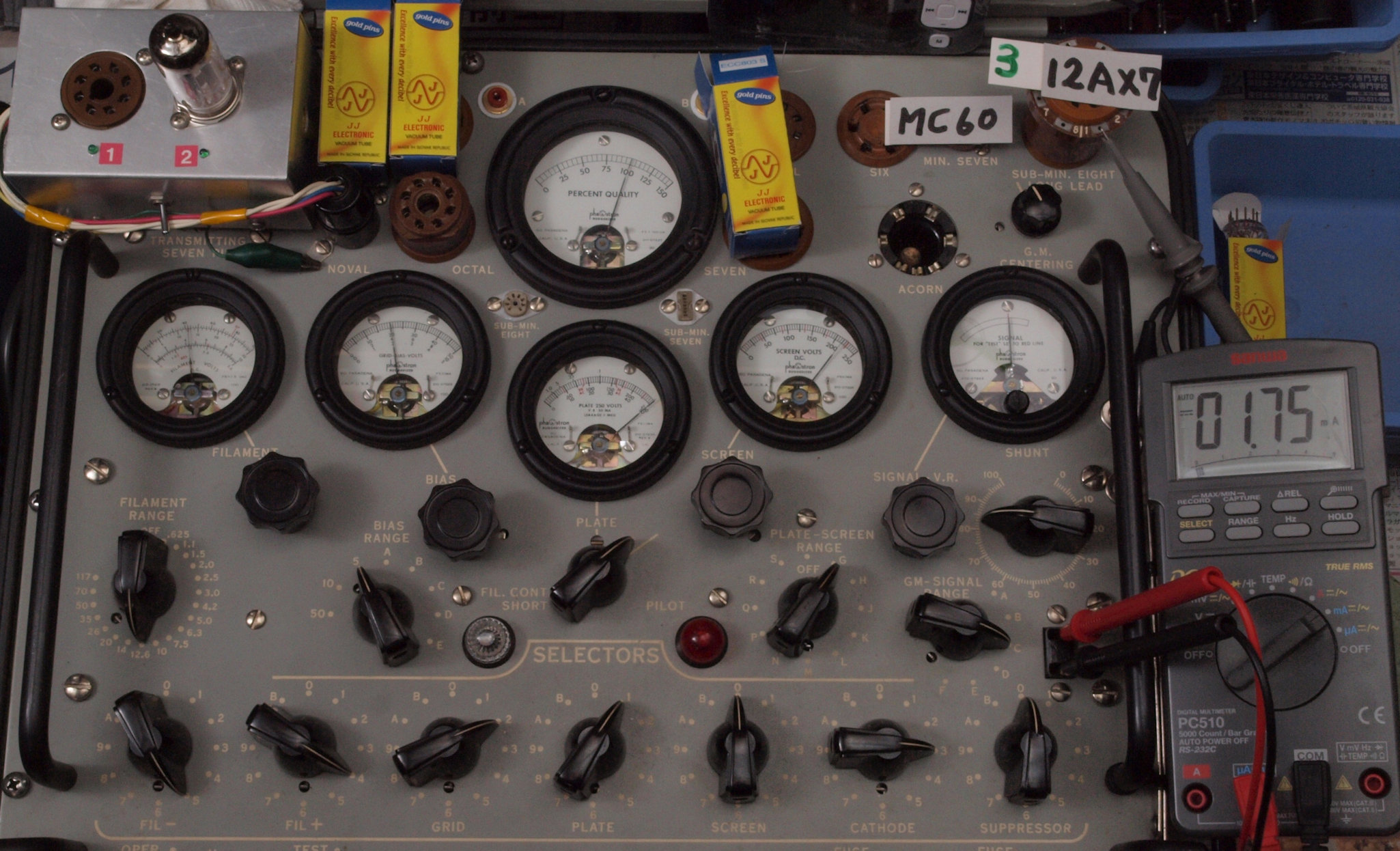 | U31. 付属真空管「12AX7」ユニット1。 Gm測定=1900μmho、Ip=1.59mA。 測定条件、「Ep=250V、Eg1=−2」、 Cレンジ=3000μmhoレンジでの測定。 |