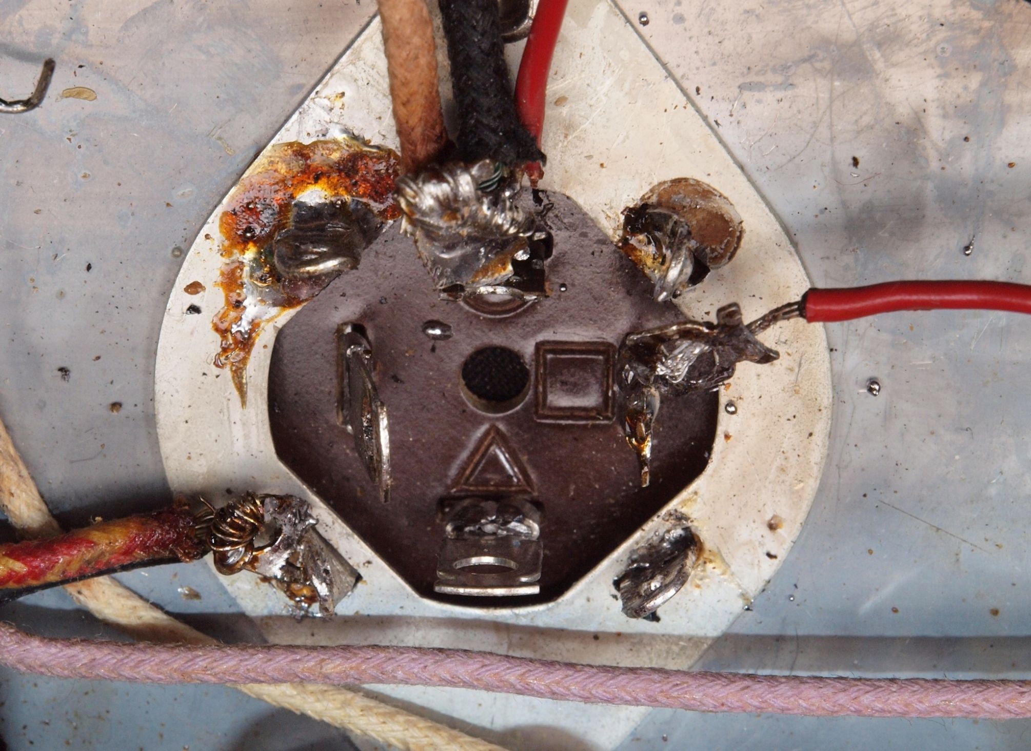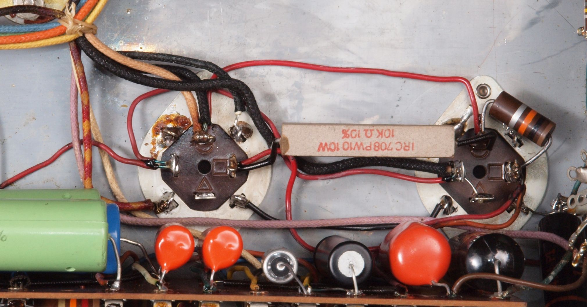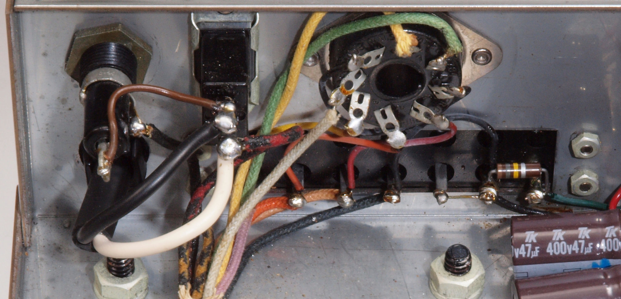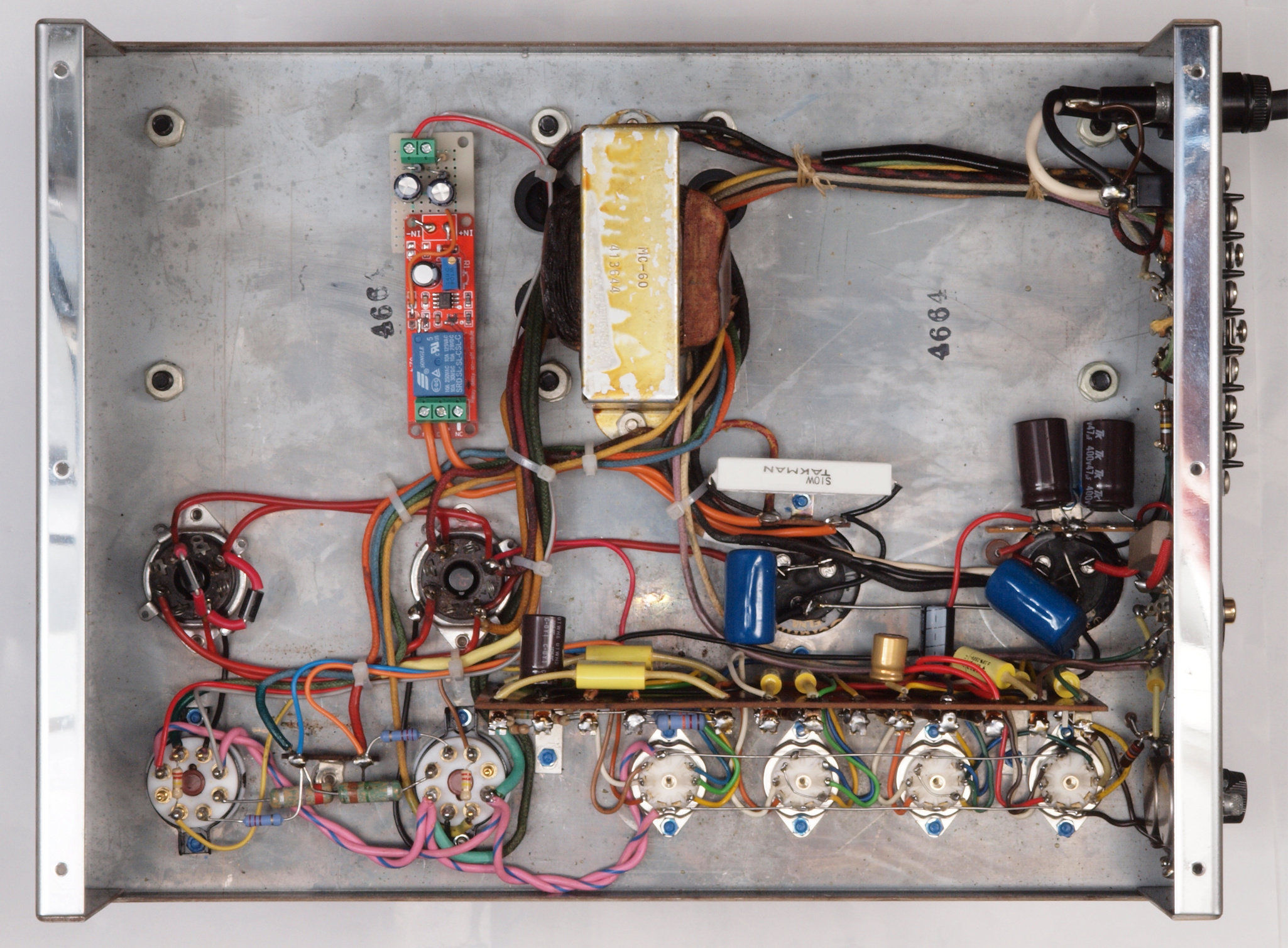 | C. 修理状況。 画像をクリックすると、大きく(横幅2050ドット)表示されます。 C11. 修理前 5U4、KT-88ソケット回り配線 |