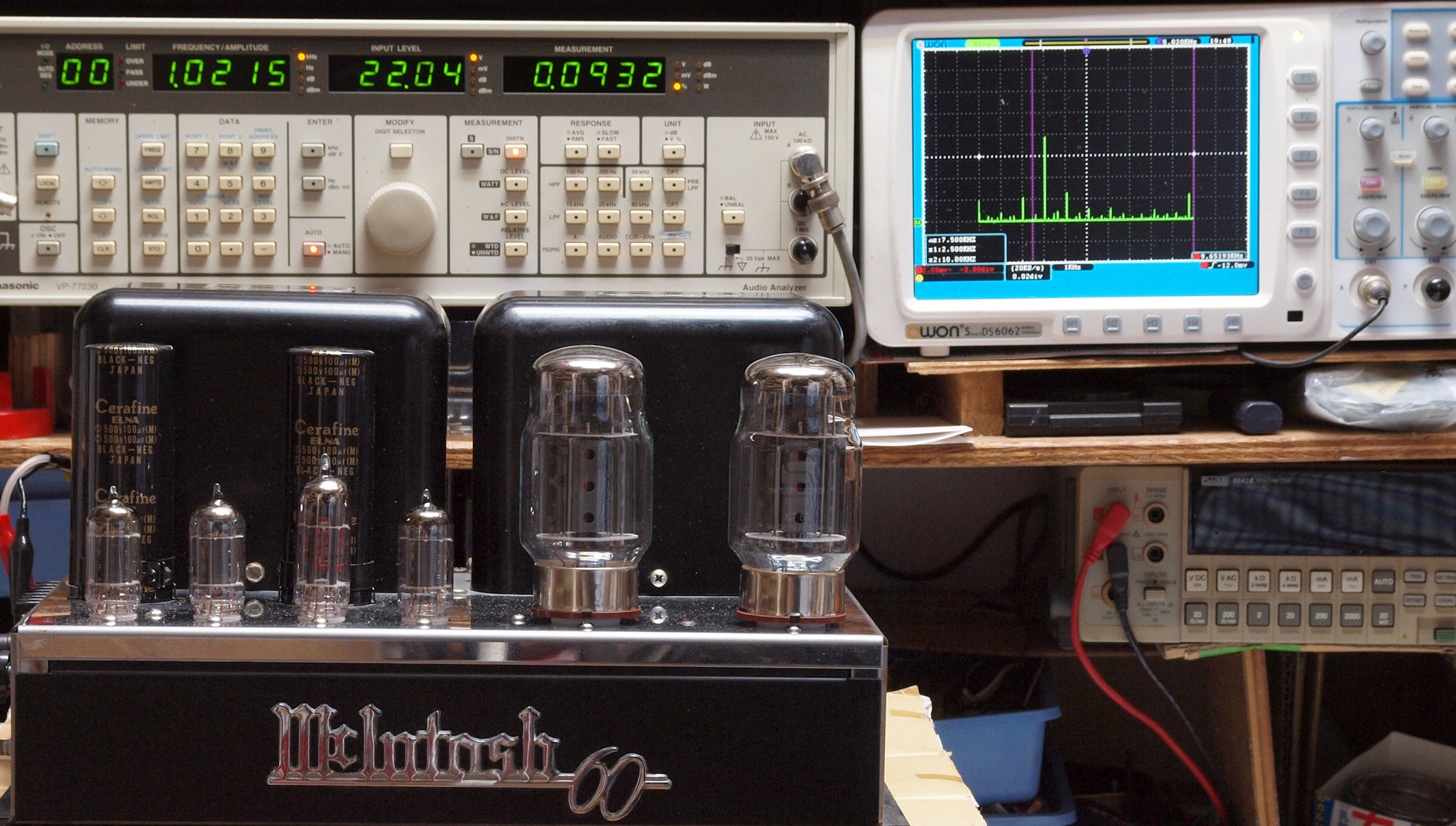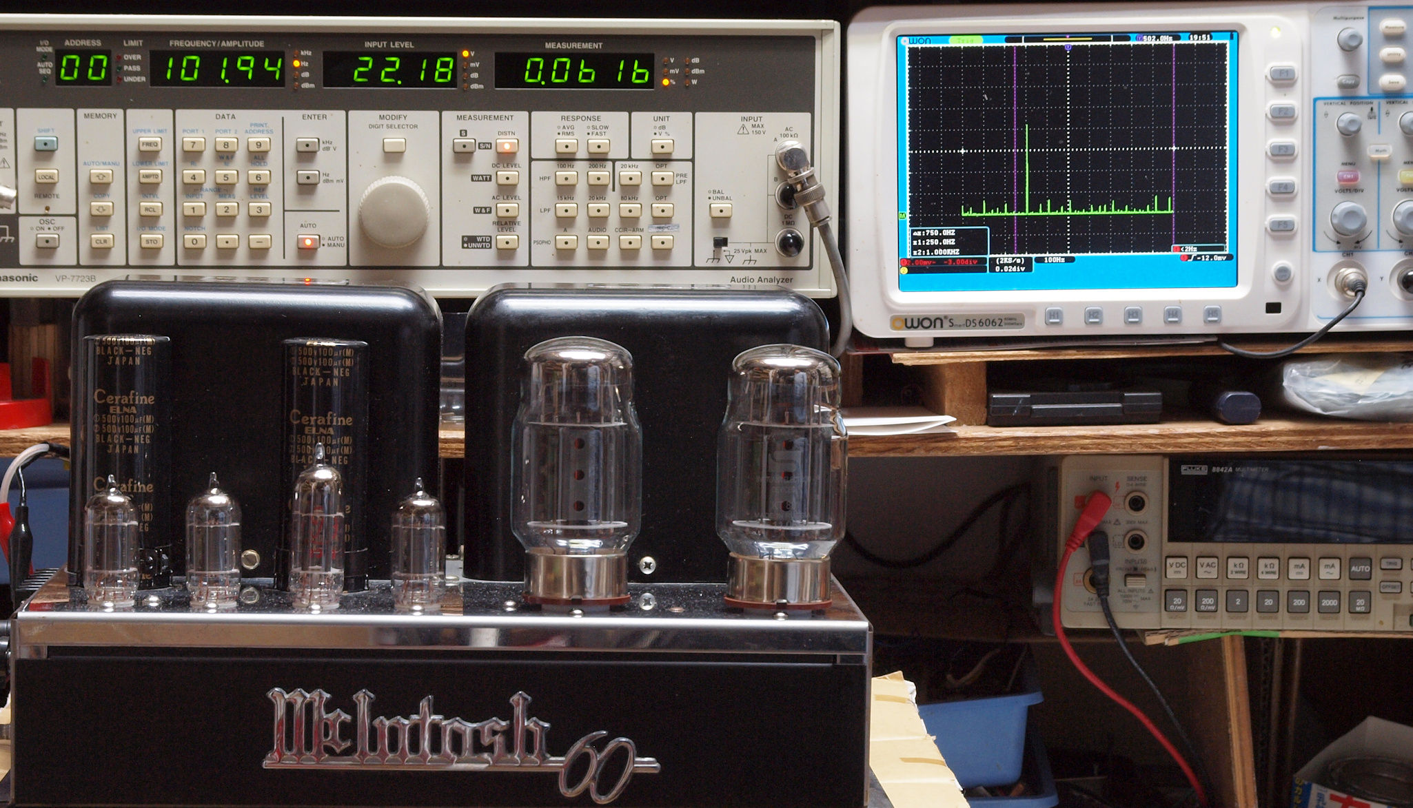 E. 調整・測定 F. 修理費 110,000円 「オーバーホール修理」 「但し、真空管は別途」 R. 整流真空管5T4、5AR4及びダイオード整流によるの高圧電圧と高圧電流比較 Y. 納品後のユーザの使用状況 S. Mcintosh MC60 の仕様(マニアル・カタログより) このクラスのKT−88は良質な物を選択すること。 又、前段12AZ7/12AT7と直結なので、こちらも同様の配慮が必要。 |