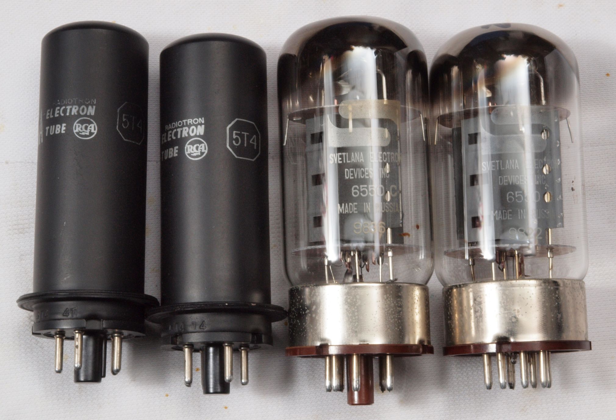 | A61. 点検中 郵送でセンターピンが折れた 終段出力管6550、 左は金属整流管5T4。 | ||||||||||||||||||||||||