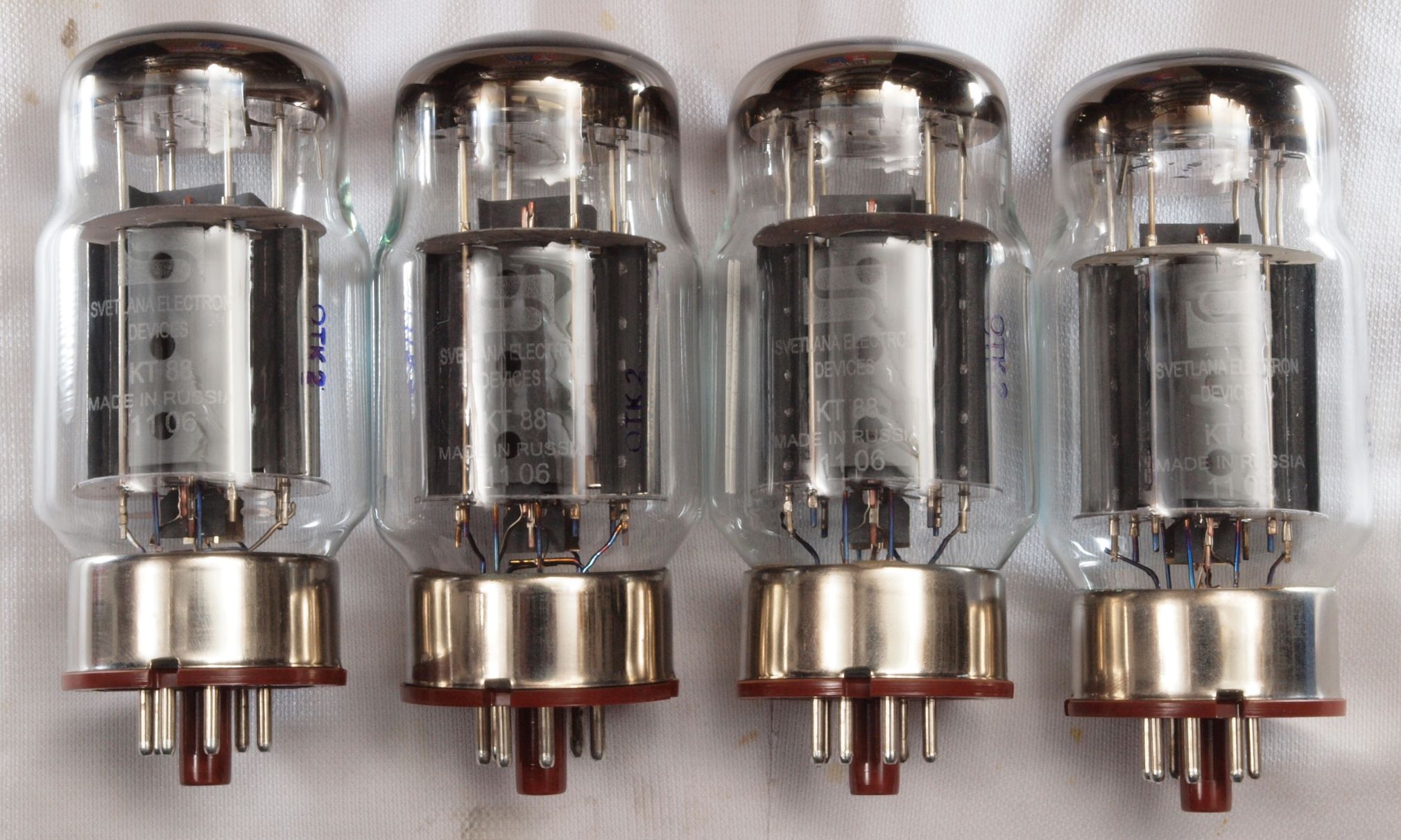 | V9. 購入真空管 KT88 Svetlana Sロゴ 左から1本目、2本目=17台目用。 3本目、4本目=18台目用。 購入先 真空管ハンドブック(規格表)の、 相互コンダクタンス=11500μmho「Ep=250V、Esg=250V、Eg1=−15V、Ip=140mA」 1960/1962/1964/1966ナショナル真空管ハンドブック、1995オーディオ用真空管マニアル、60/62/69東芝電子管ハンドブック、1962日立電子管ハンドブック、1965/1971全日本真空管マニュアル、RC15/19/26/27/28/29/30 Receiving Tube Manual、1966実用真空管ハンドブック、1995世界の真空管カタログより。 |
