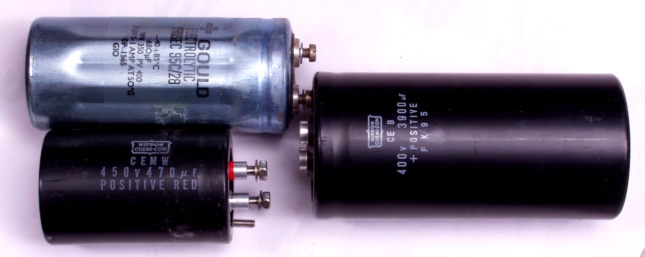 A5. 修理前点検 左=着いている電解コンデンサー680μF470μF、右=交換する物3900μF×2本使用